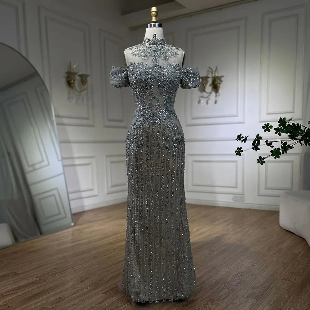 2025 Arabic Silver Nude Mermaid Beaded Crystal Luxury Dubai Evening Dresses Gowns for Women Wedding Party LA72411