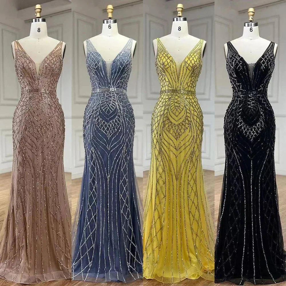 2025 Blue Mermaid Elegant Spaghetti Straps Beaded Luxury Evening Dresses Gowns for Woman Wedding Party LA72450
