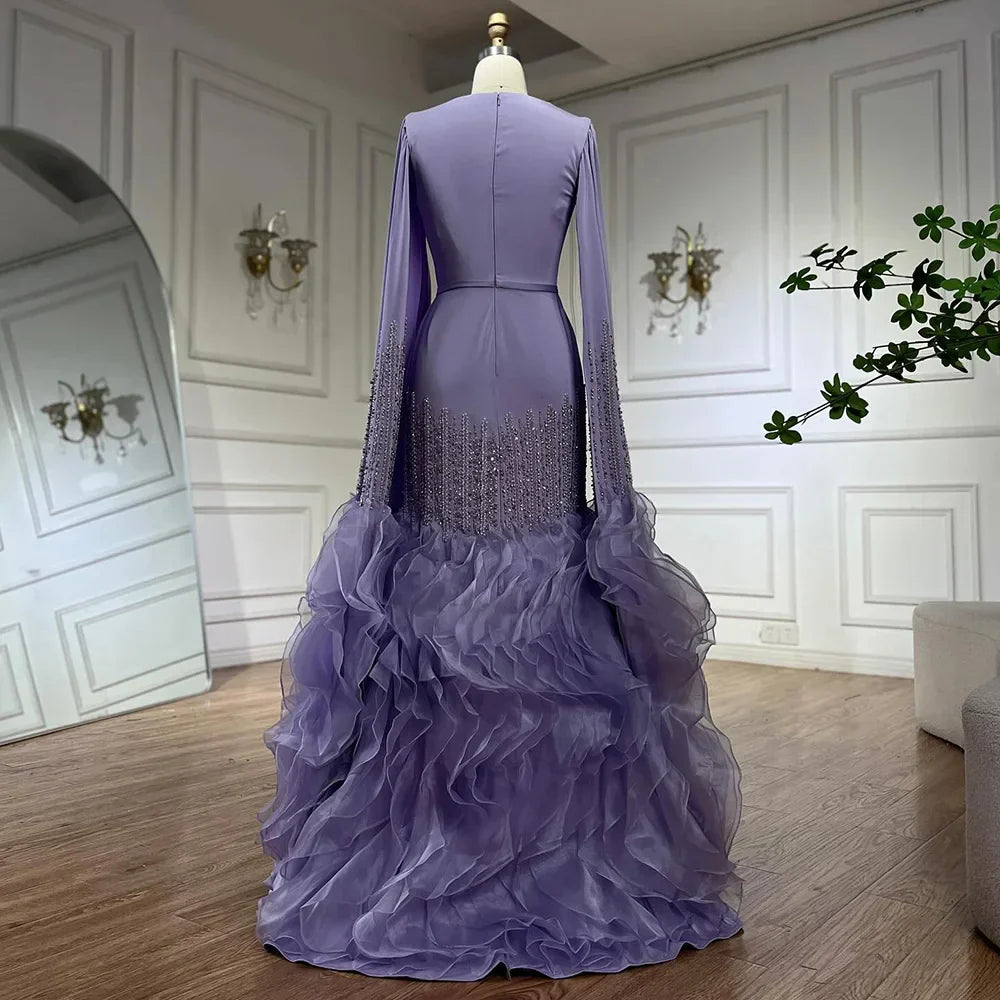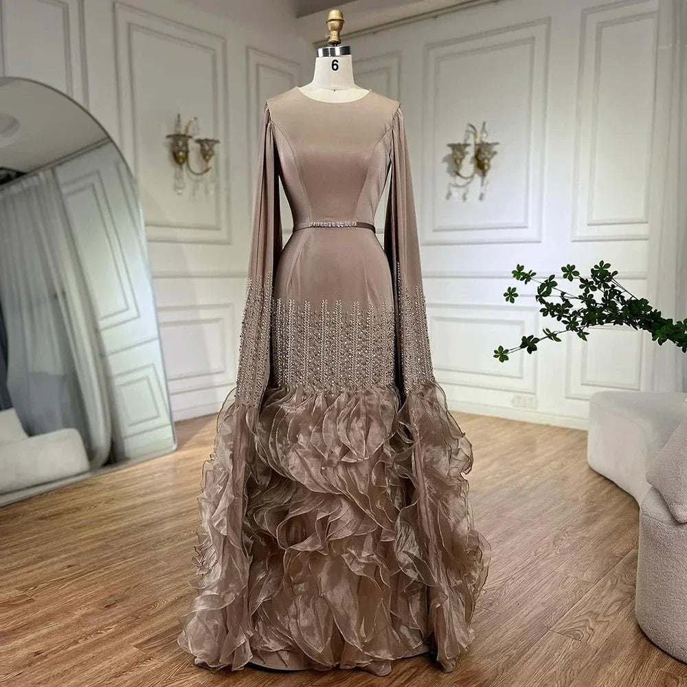 With its mermaid silhouette. cape sleeves. and tiered ruffles. this dress exudes elegance and luxury. Perfect for weddings and parties. this dress will make you feel like a mermaid princess. Don't miss out on this stunning piece.