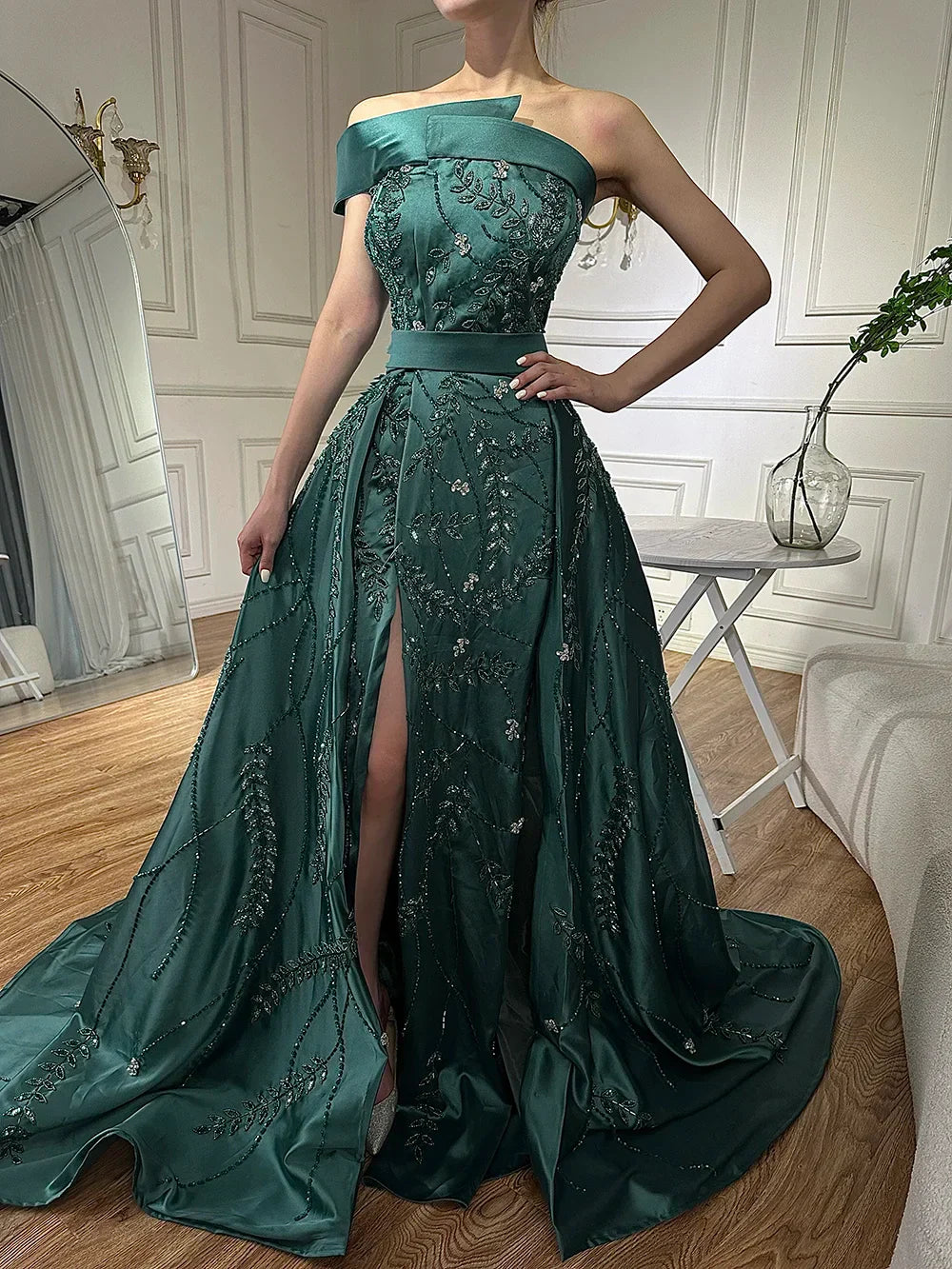 2025 Green Arabic One-Shoulder Satin Evening Gown Beaded Dress with Overskirt and Split for Formal Occasion LA72178