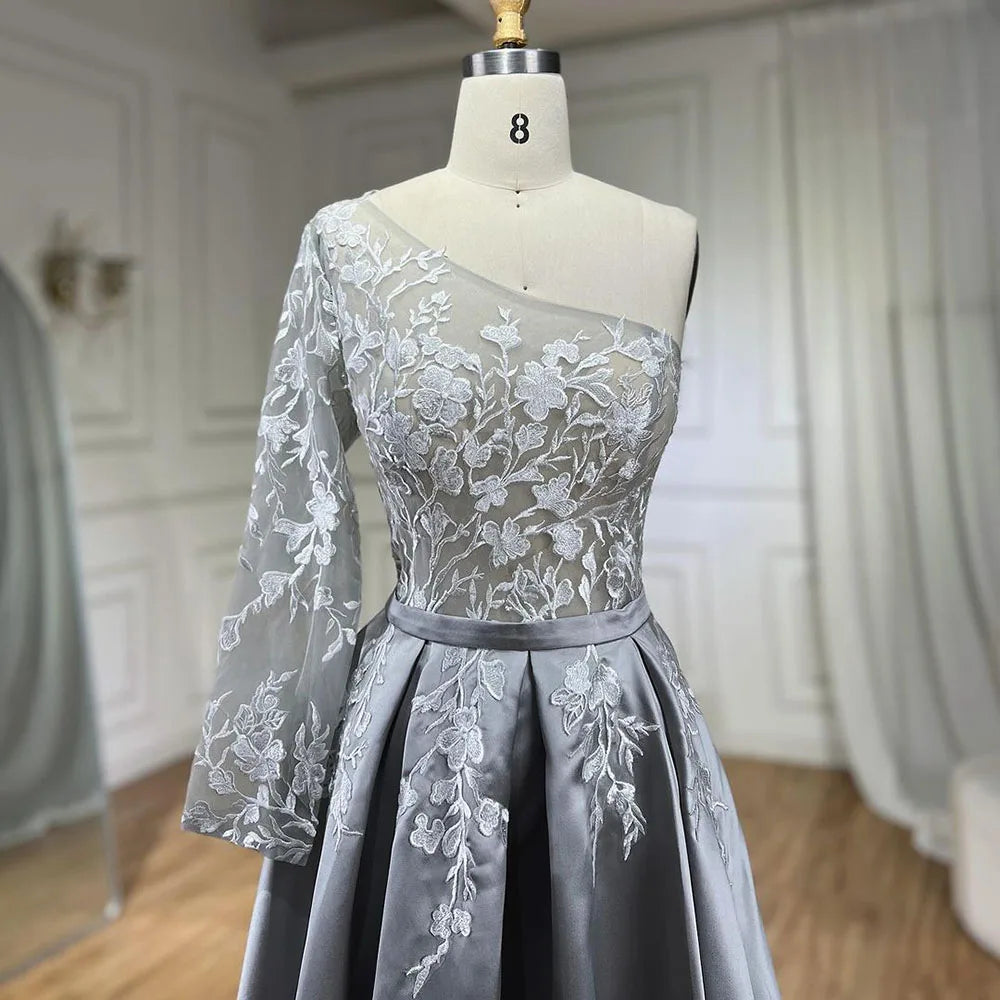 2025 Grey Satin Elegant Evening Dress One Shoulder Handmade Flowers A Line Formal Gown LA70043