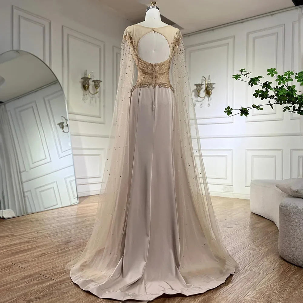 2025 Nude Cape Sleeves Satin A Line Lace Beaded Luxury Dubai Evening Dresses Gowns for Women Wedding Party LA72702