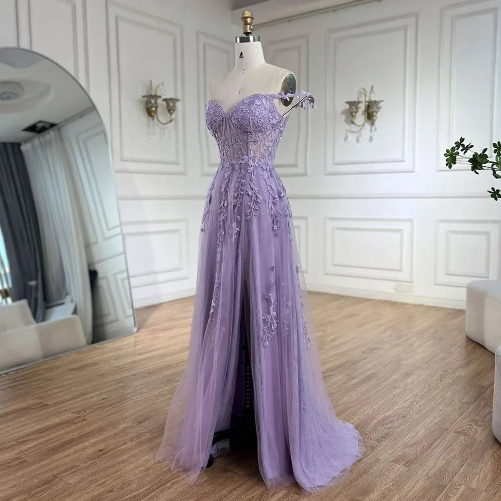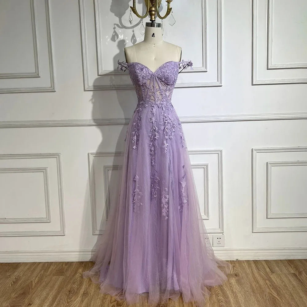 2025 Lilac Spaghetti Strap Lace-Up Back A-Line Appliqué Prom Dress for Women | Wedding Party LA72620