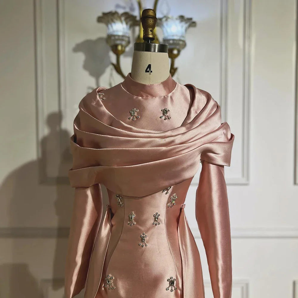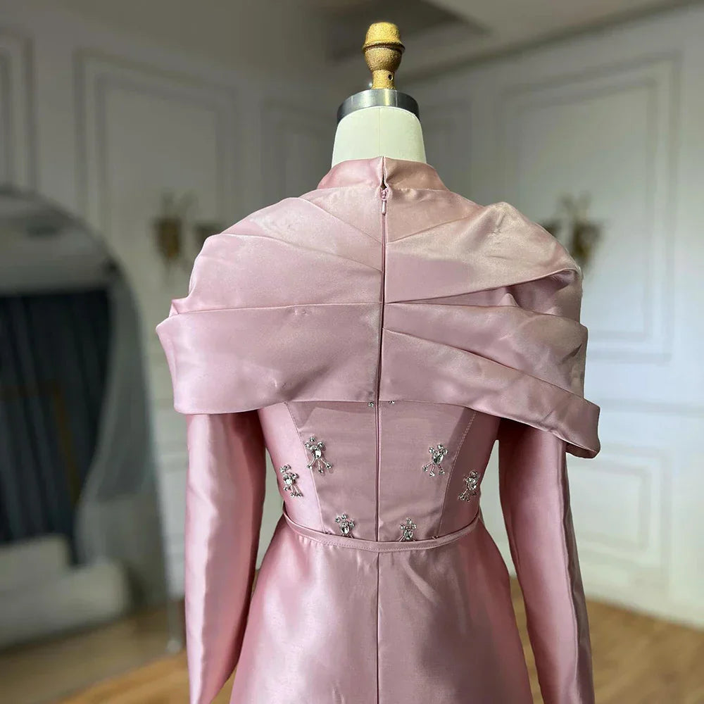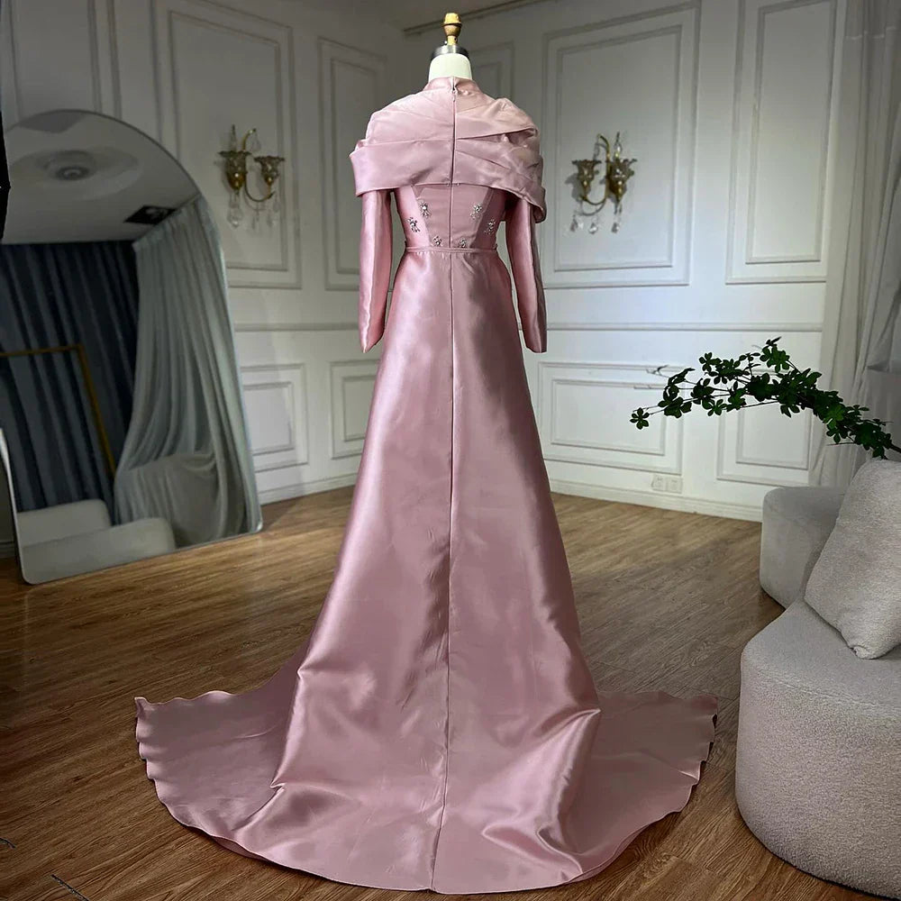 2025 Muslim Blue Mermaid Beaded Satin Luxury Saudi Evening Dress Gown Overlay Skirt for Formal Occasion LA72414M