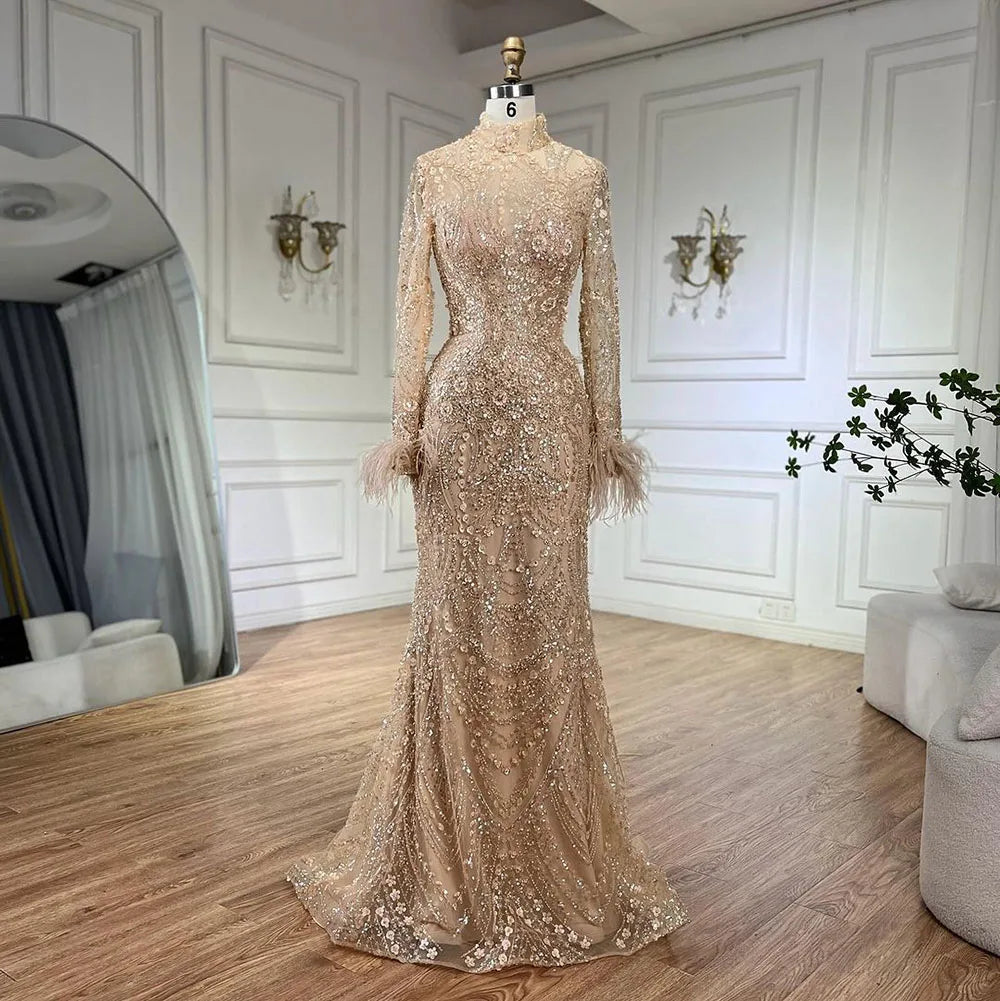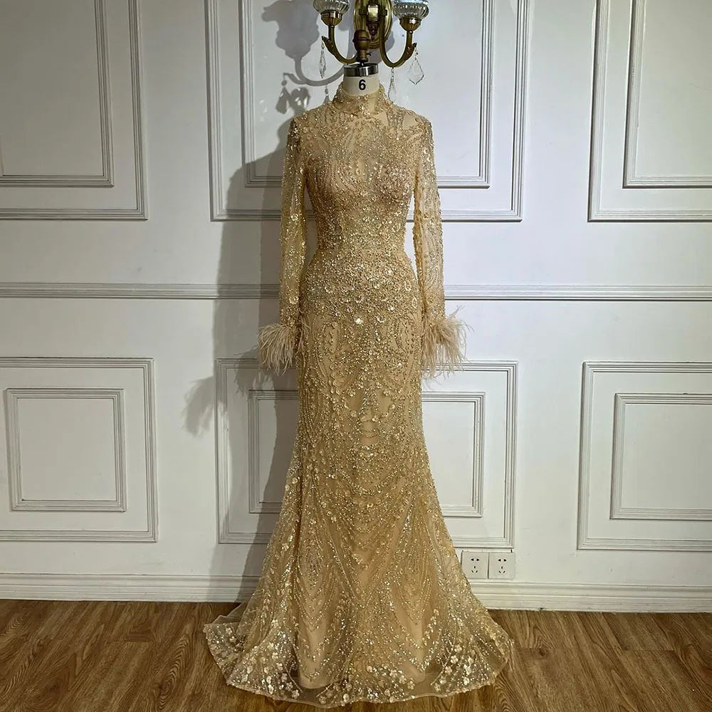 2025 Muslim Women Wedding Party Dubai Gowns Gold Luxury Beaded Feathers Mermaid Long Evening Dresses LA72546