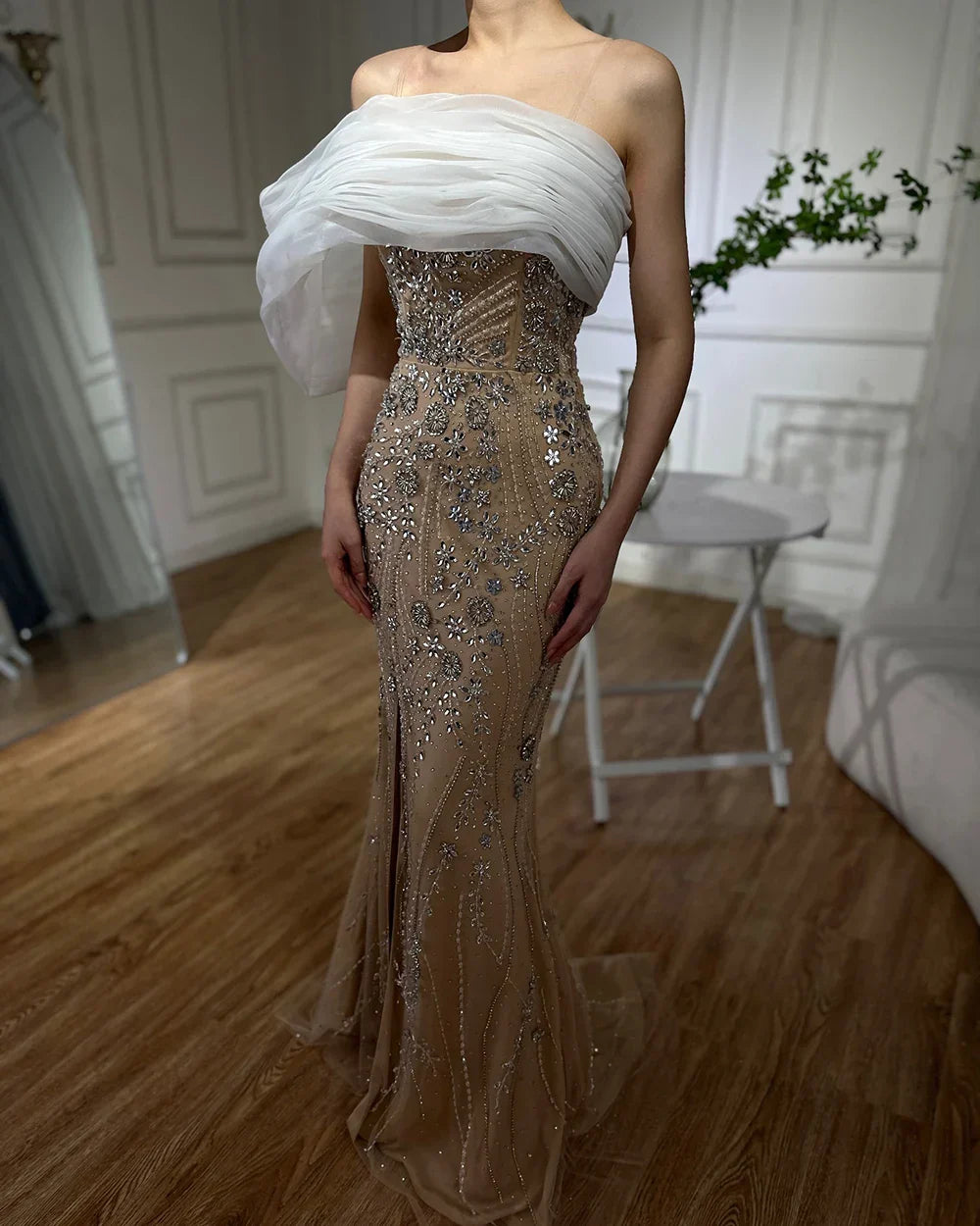 2025 Nude One Shoulder Split Saudi Arabic Evening Gown Beaded Dress for Formal Occasion LA72746