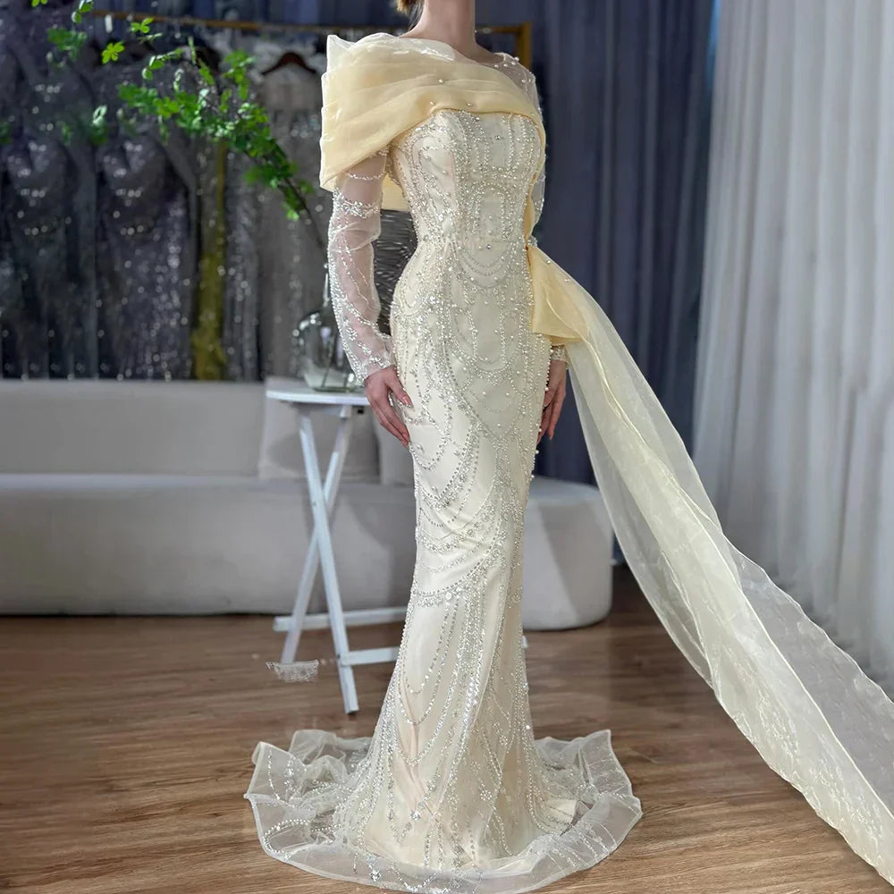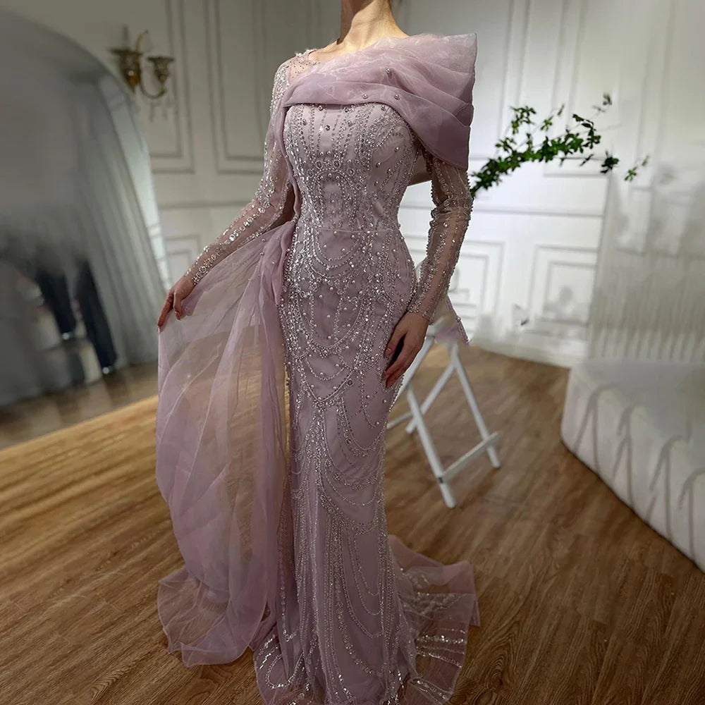 2025 Pink Mermaid Luxury Beaded Pearls Evening Dress with Overskirt Gown for Formal Occasion LA72348A
