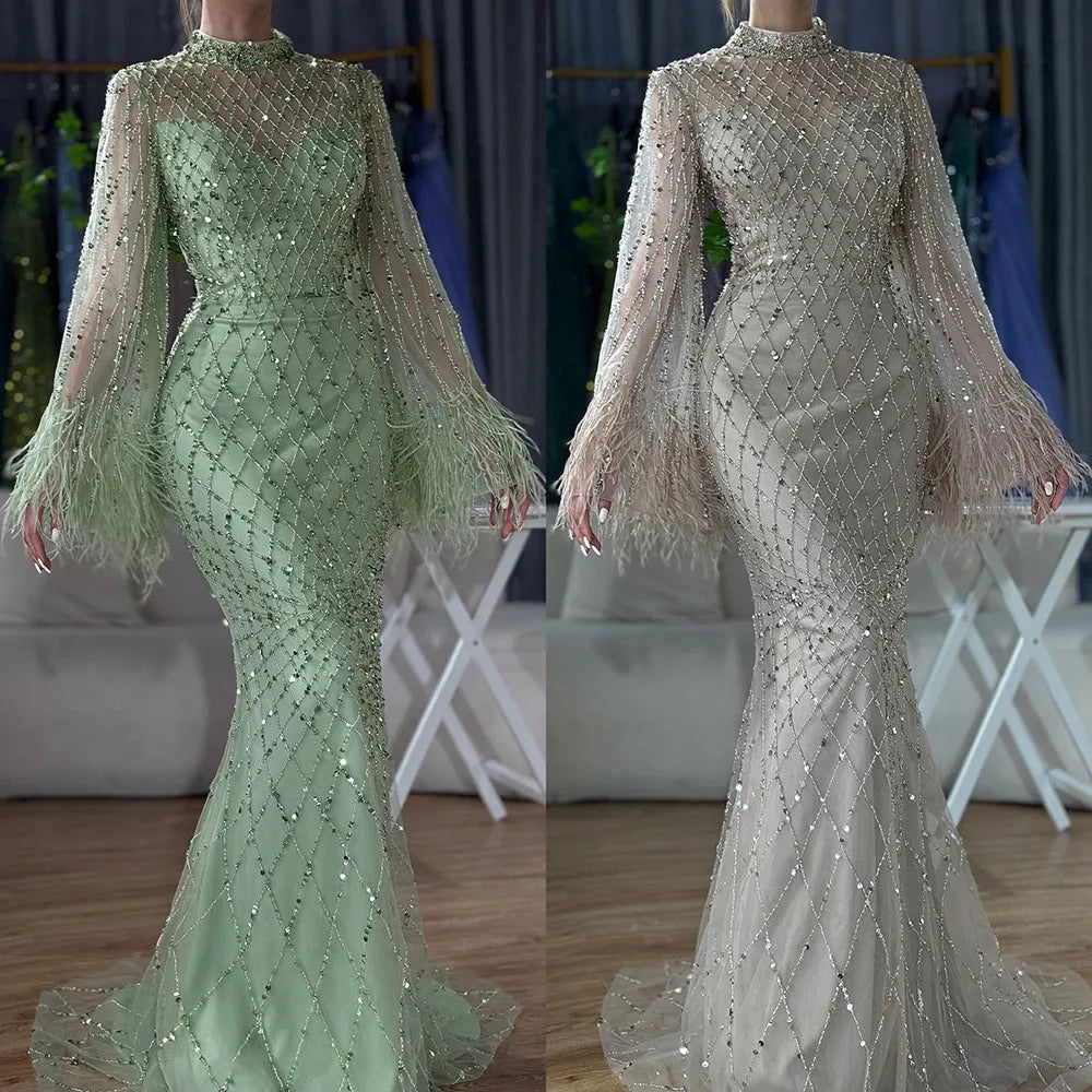 Luxury Beaded Feathers Sage Green Evening Dress Long Sleeves LA72394A