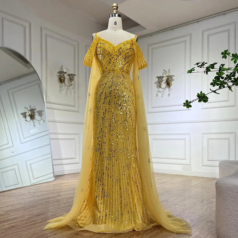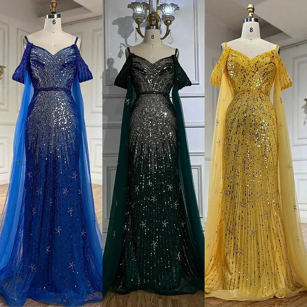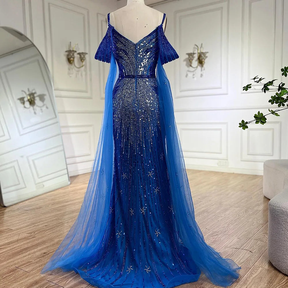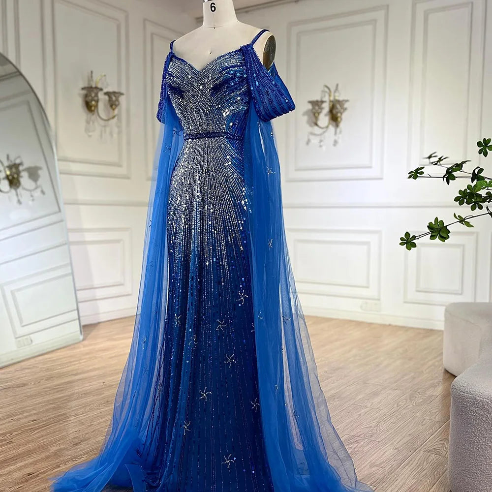 2025 Spaghetti Strap Blue Mermaid Beaded Luxury Evening Dress with Cape Sleeves for Formal Occasion Saudi LA72707