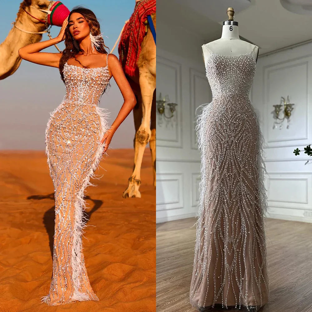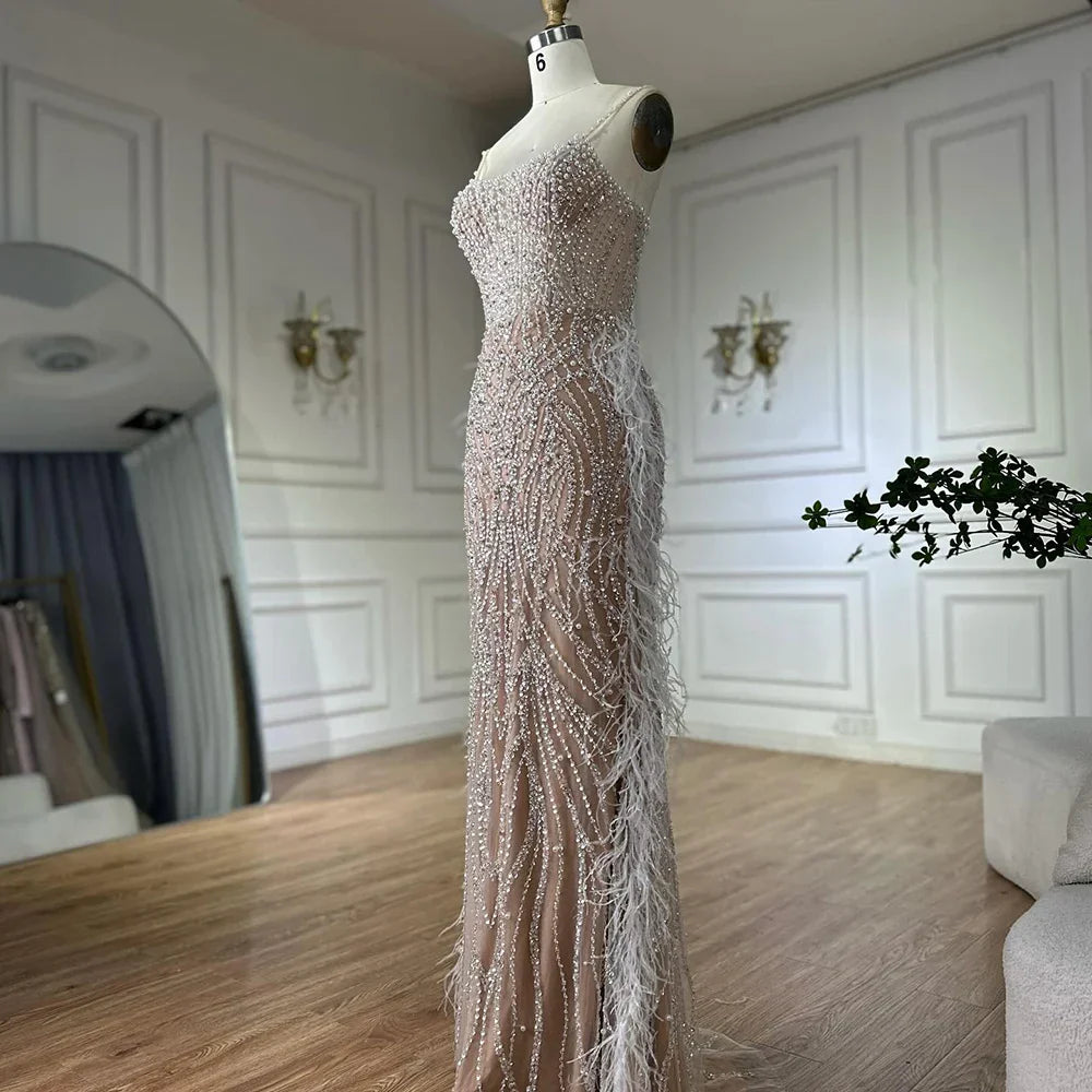2025 Arabic White Nude Spaghetti Strap Feathers Beaded Mermaid Evening Gown for Formal Occasion LA72823
