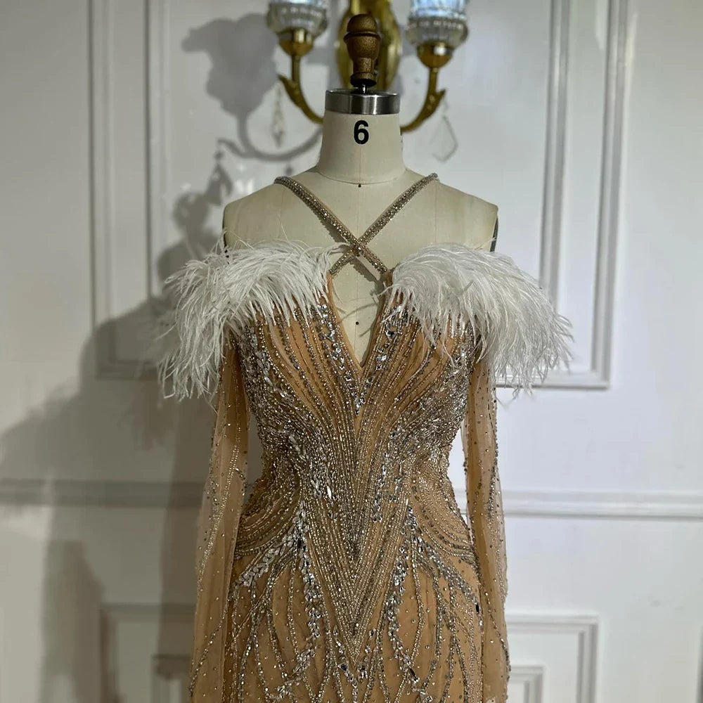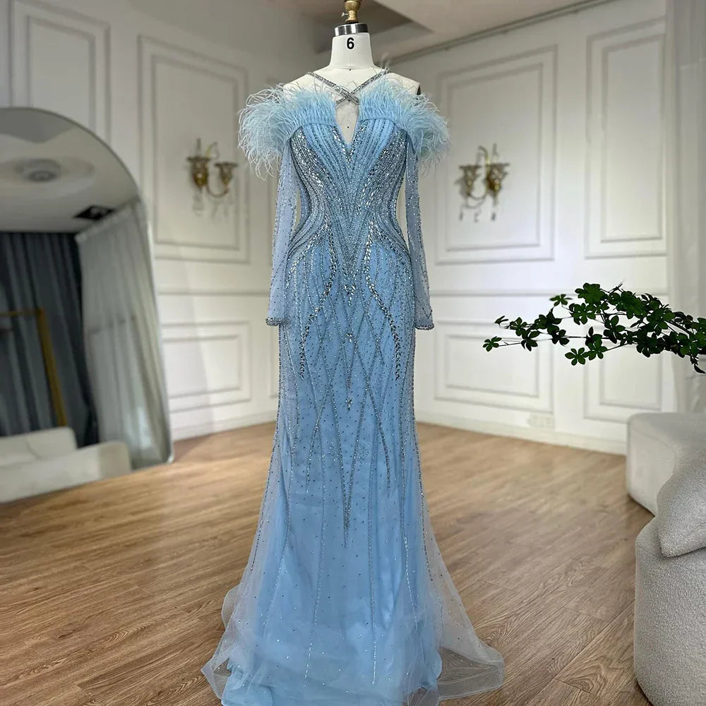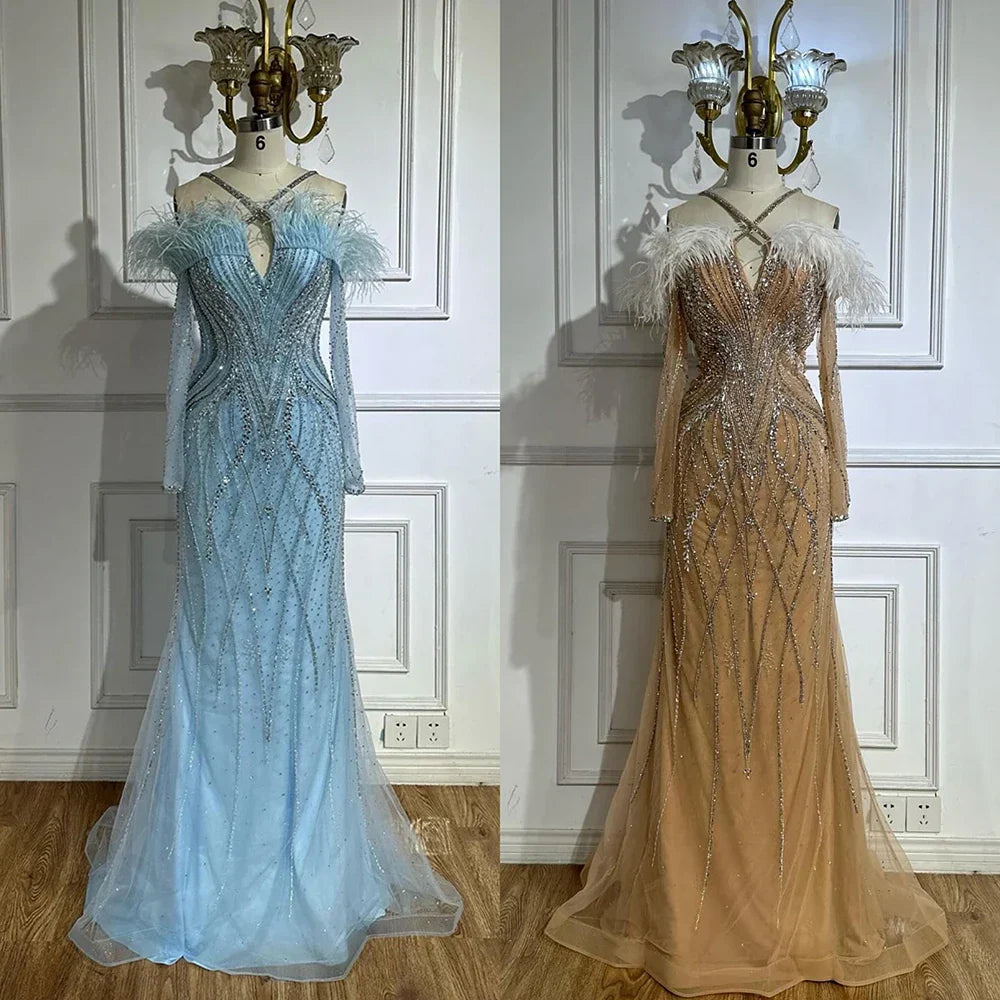 2025 Blue Feather Beaded Luxury Mermaid Evening Dresses Gowns for Women Formal Occasion LA72836