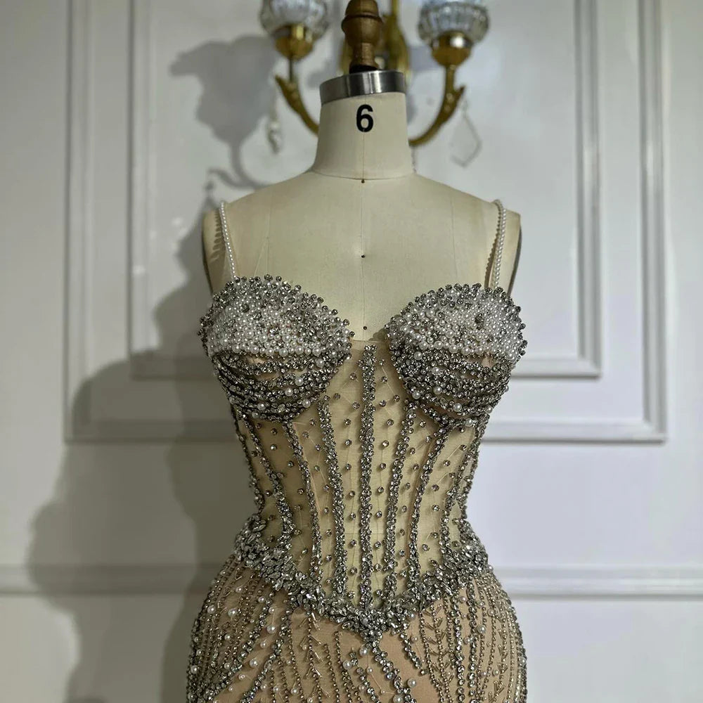 2025 Elegant Spaghetti Strap Pearl Beaded Mermaid Evening Gown for Formal Occasion LA72865