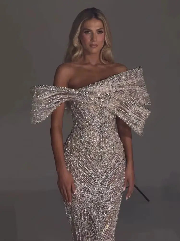 2025 Luxury Off Shoulder Silver Beaded Mermaid Saudi Evening Dress Gown for Formal Occasion LA72878