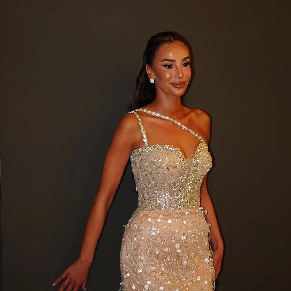 2025 Nude Beaded One-Shoulder Evening Gown with Crystal for Formal Occasion LA72872