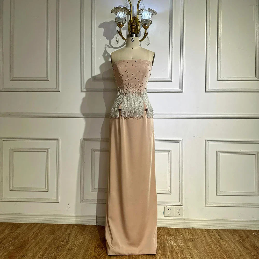 2025 Saudi Nude Pink Strapless Arabic Mermaid Evening Dresses Gowns Beaded Tassel for Occasion LA72804