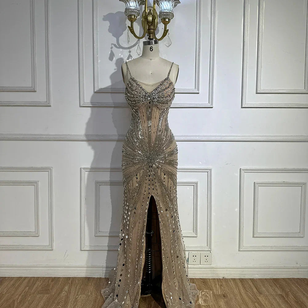 2025 Silver Nude Beaded Spaghetti Strap Mermaid Evening Dresses Gowns for Formal Occasion LA72803