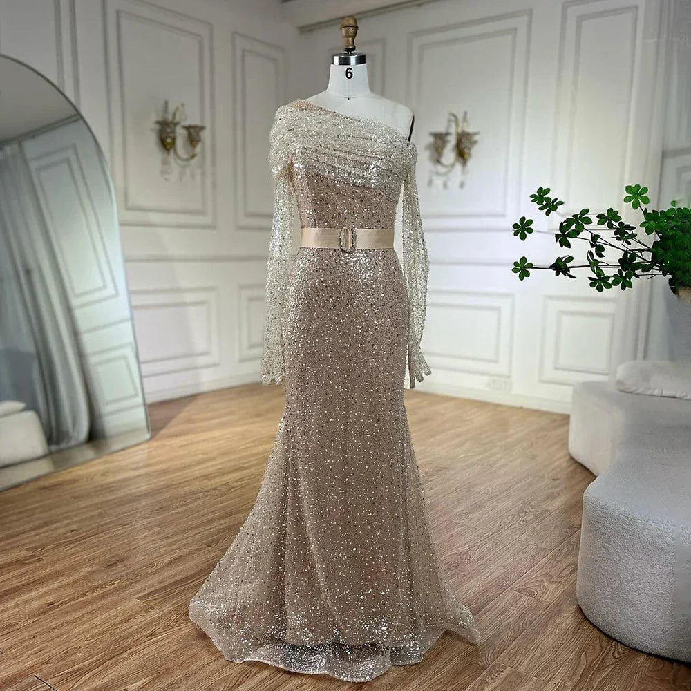 Arabia caramel Mermaid One Shoulder Luxury Beaded Evening Dresses Gowns 2025 For Women Wedding Party LA72285