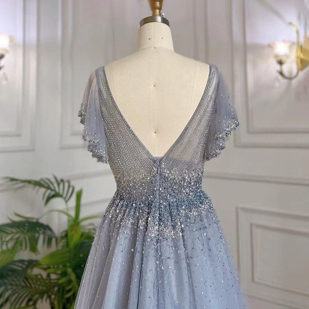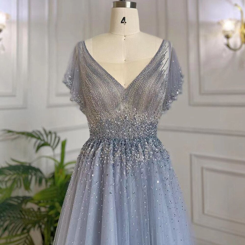 Arabic A-Line Blue Sexy V NECK Luxury Beaded Dubai Evening Dresses For Women Elegant Party 2025 LA71899