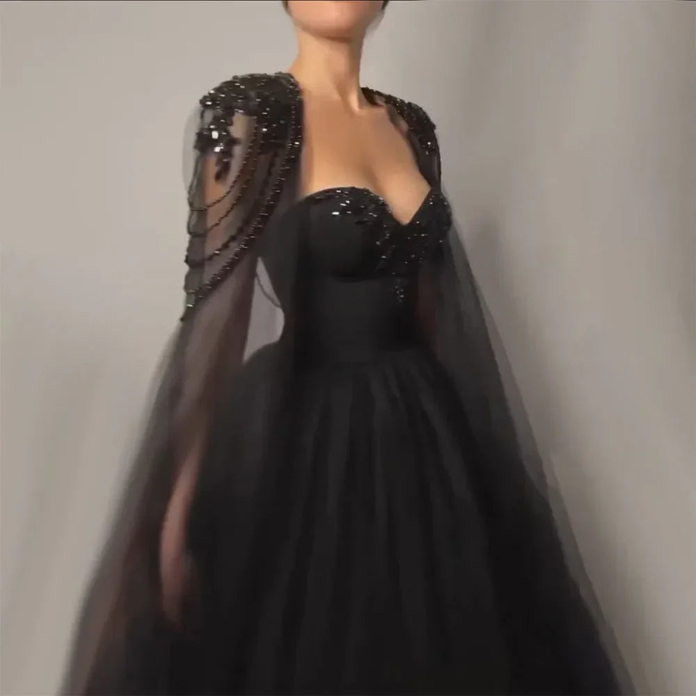 Arabic Black Elegant Cape Sleeve A Line Beaded Lace Up Evening Dresses Gowns For Women Wedding Party 2025 LA72392