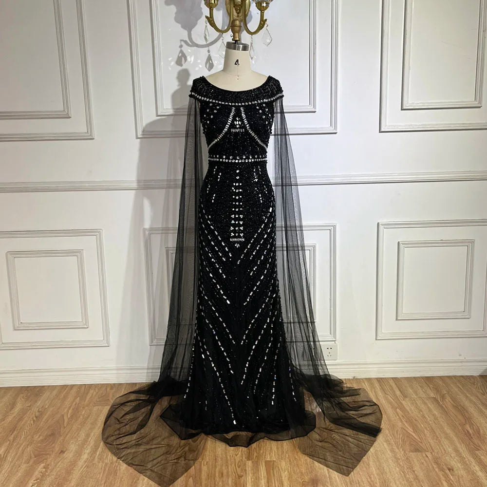 Arabic Black Mermaid Gown with Cape Sleeves and Beaded Luxury | Evening Dresses for Women Wedding Party 2025 LA72423