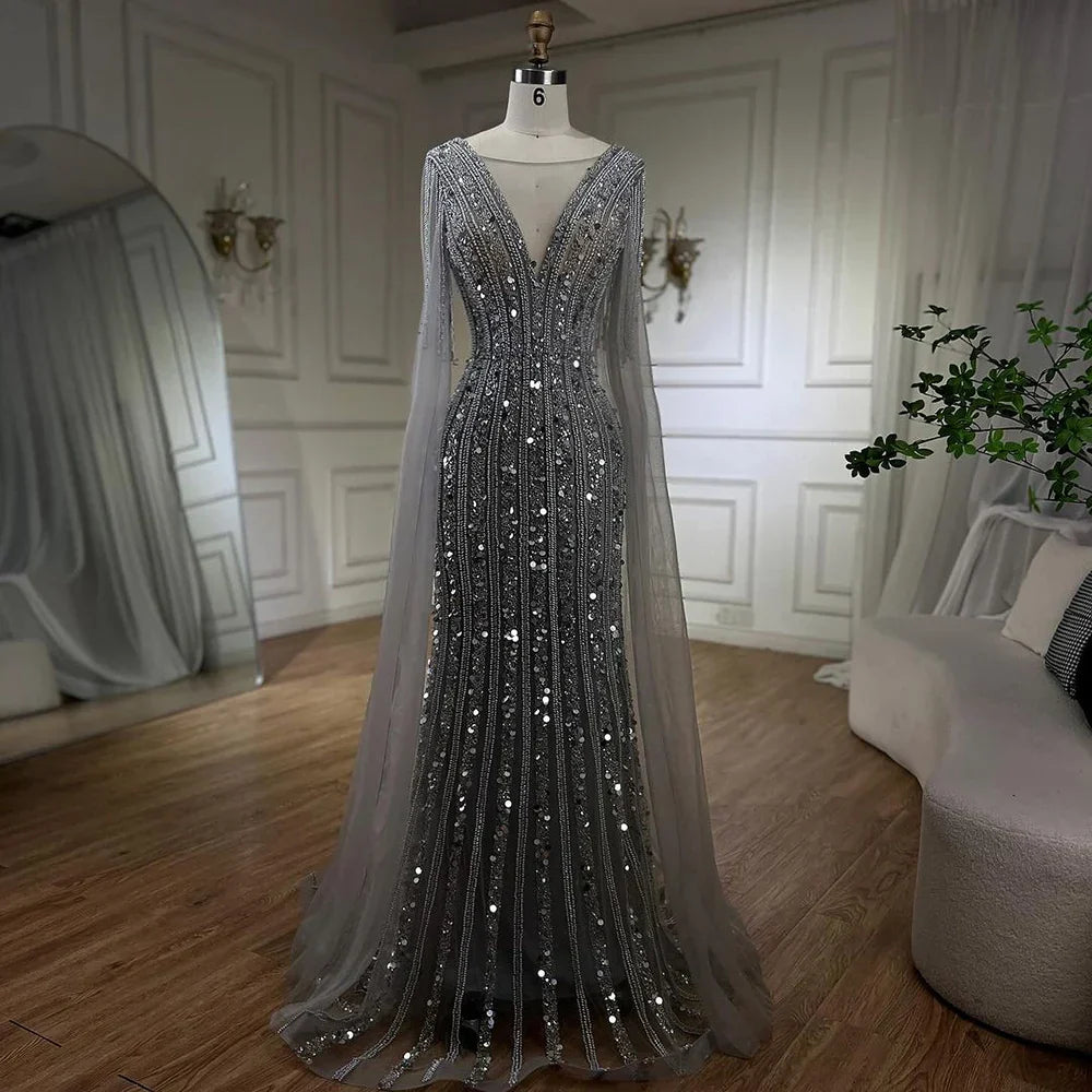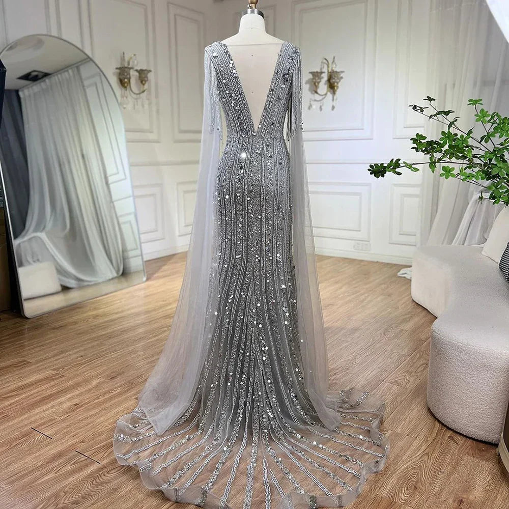 Arabic Gray Mermaid Elegant Cape Sleeves Luxury Beaded Evening Dresses Gowns For Women Wedding Party 2025 LA72289