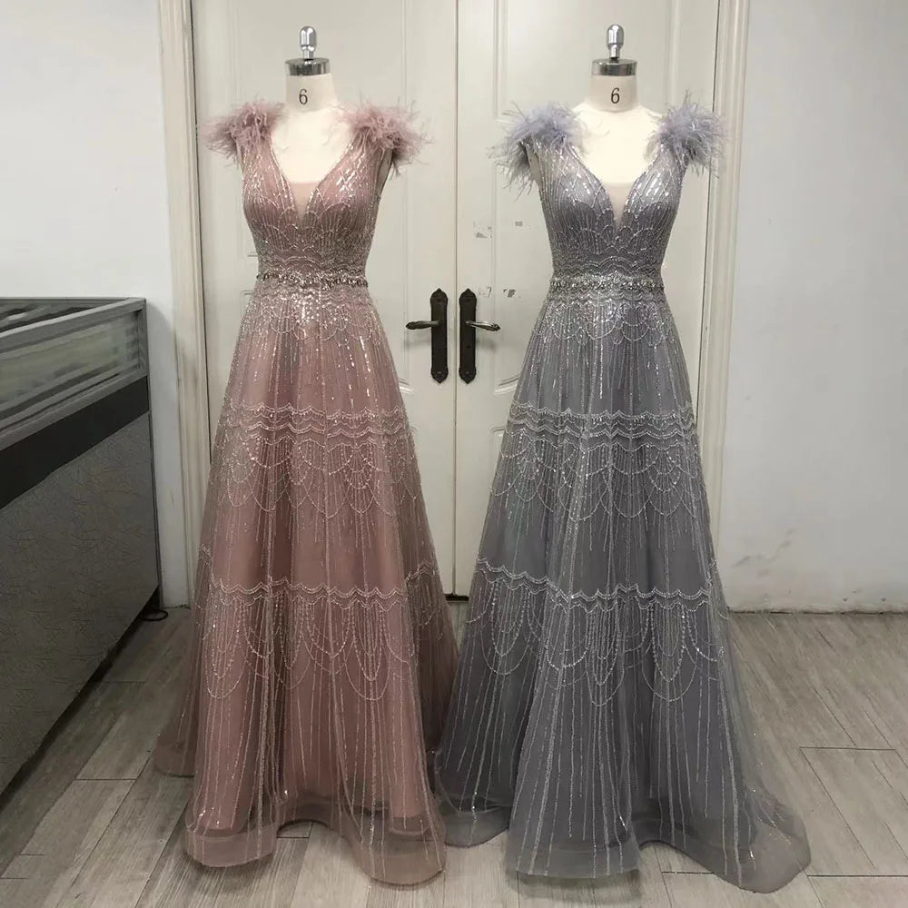 Arabic Pink A-Line Elegant Luxury Beaded Feathers Evening Dress for Women - Wedding Party 2025 LA72608