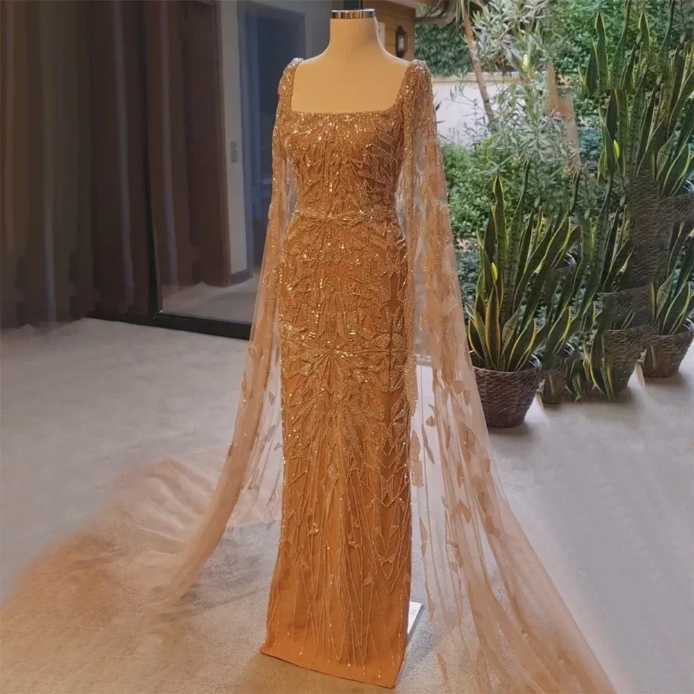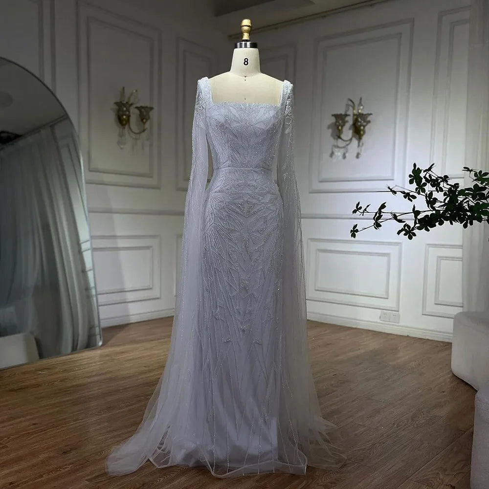 The luxurious Saudi Arabic design features a square collar and elegant cape sleeves. perfect for any wedding party. Make a statement with our haute couture gown. adding a touch of glamour to your special day.