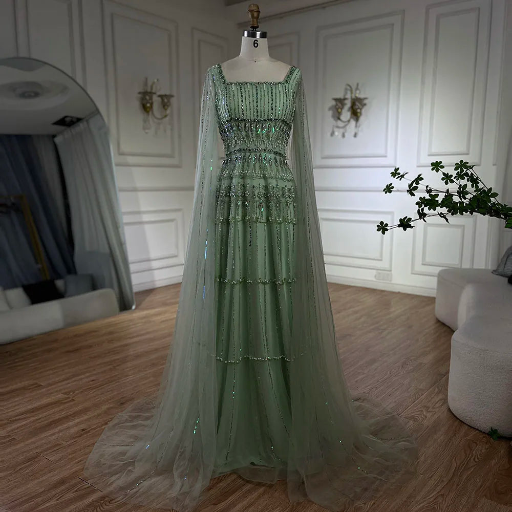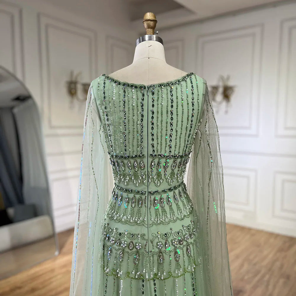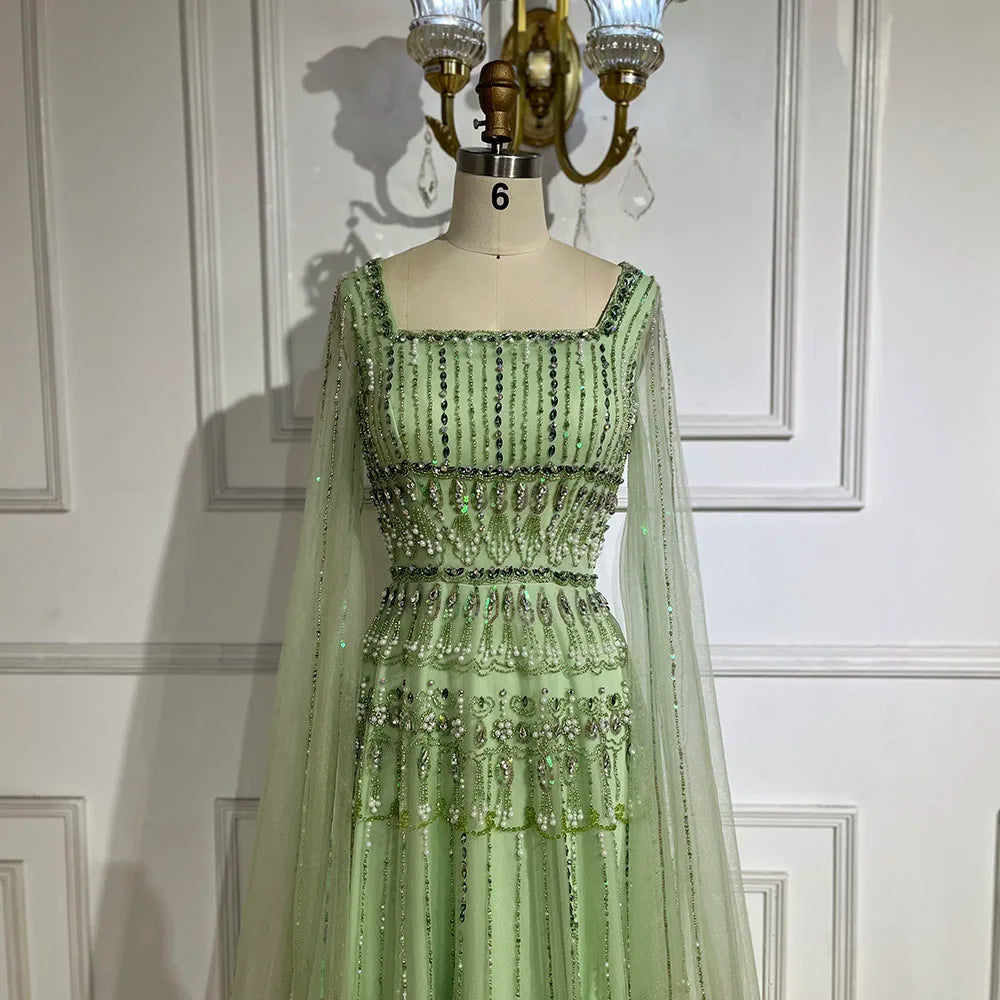 Arabic Sage Green A-Line Beaded Luxury Dubai Long Evening Gown with Cape Sleeves for Women - Party 2025 LA72595