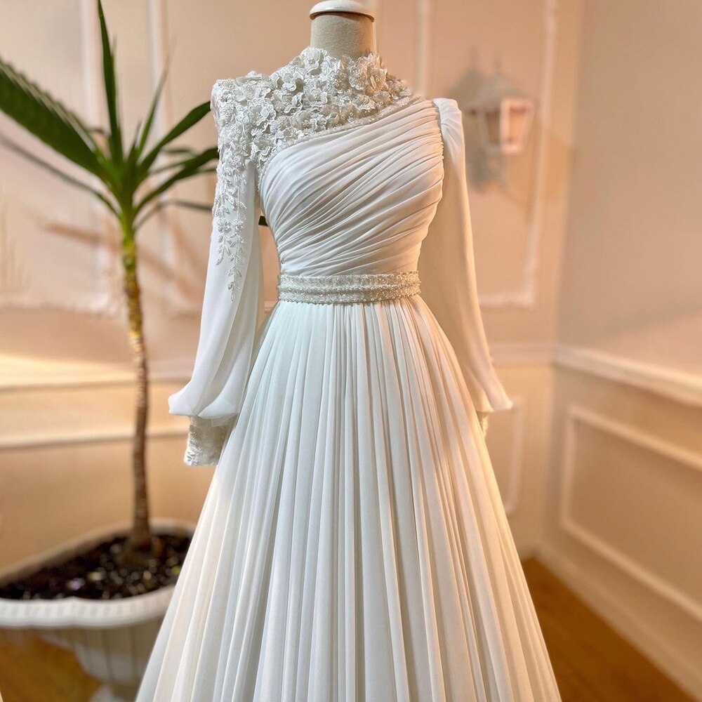 Arabic White 3D Flowers Muslim Evening Dresses Gowns 2025 Beaded A-Line For Women Party LA71515