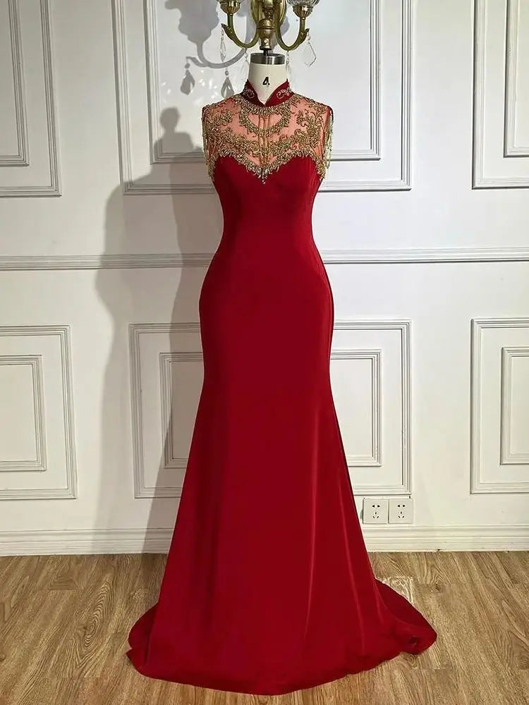 Arabic Wine Red Mermaid Elegant Satin Beaded Luxury Dubai Evening Dresses Gowns For Women Wedding Party 2025 LA72556