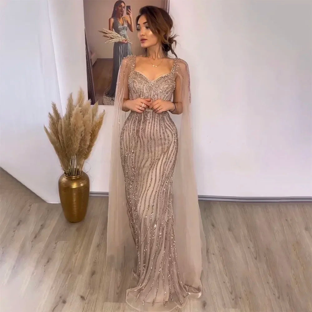 Blue Arabic Luxury Beaded Mermaid Evening Dress Gown with Cape Sleeves LA71715