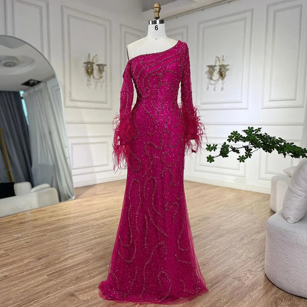 Blue Mermaid Elegant One-Shoulder Beaded Feathers Luxury Evening Dress Gown for Women's Wedding Party 2025 LA72395