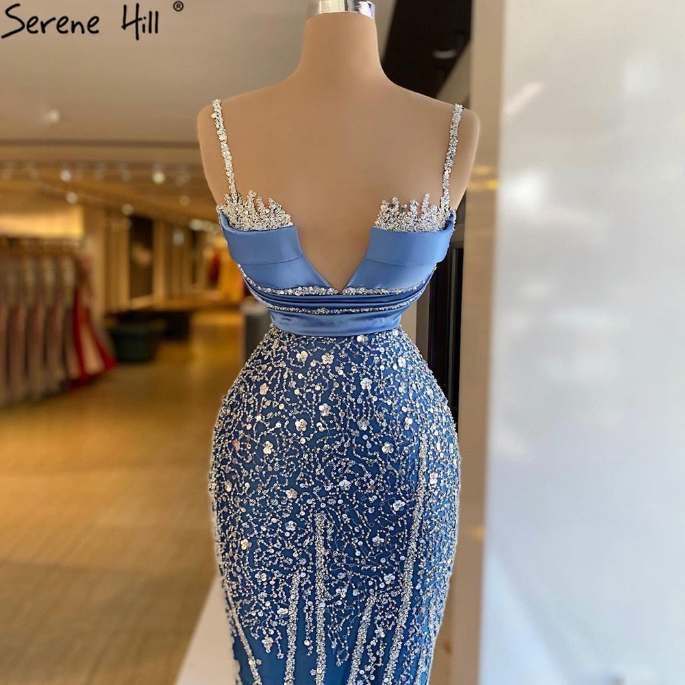 Blue Spaghetti Strap Mermaid Evening Dresses Gowns 2025 Luxury Beaded Elegant For Women Party LA71243