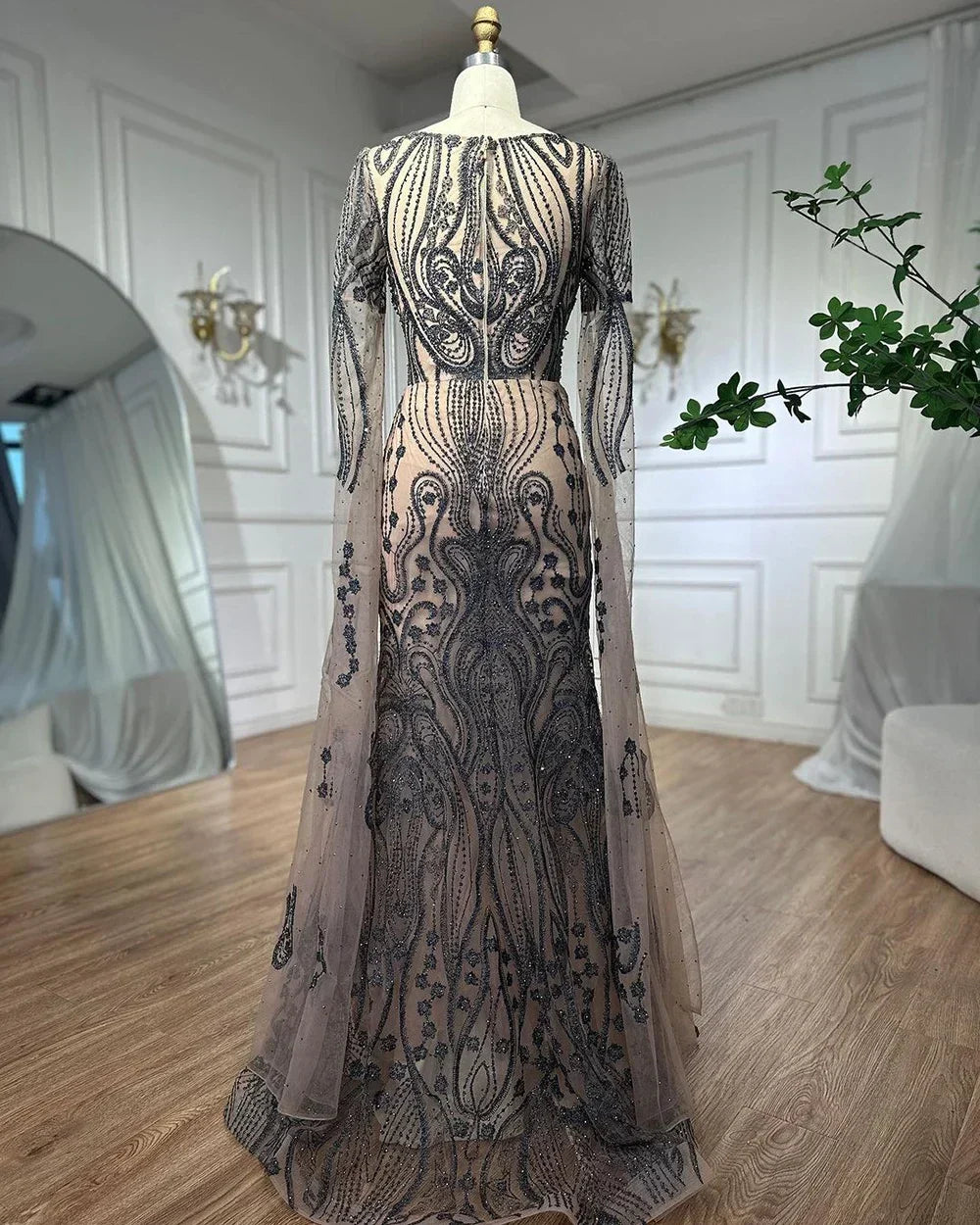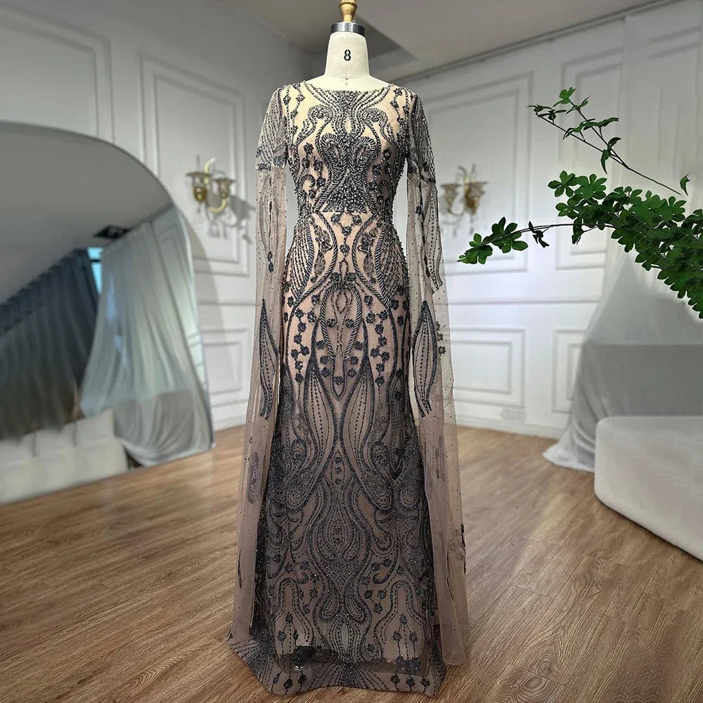 Brown Arabic Mermaid Elegant Cape Sleeves Sexy Evening Dresses Gowns 2025 Luxury Beaded For Women Party LA71832