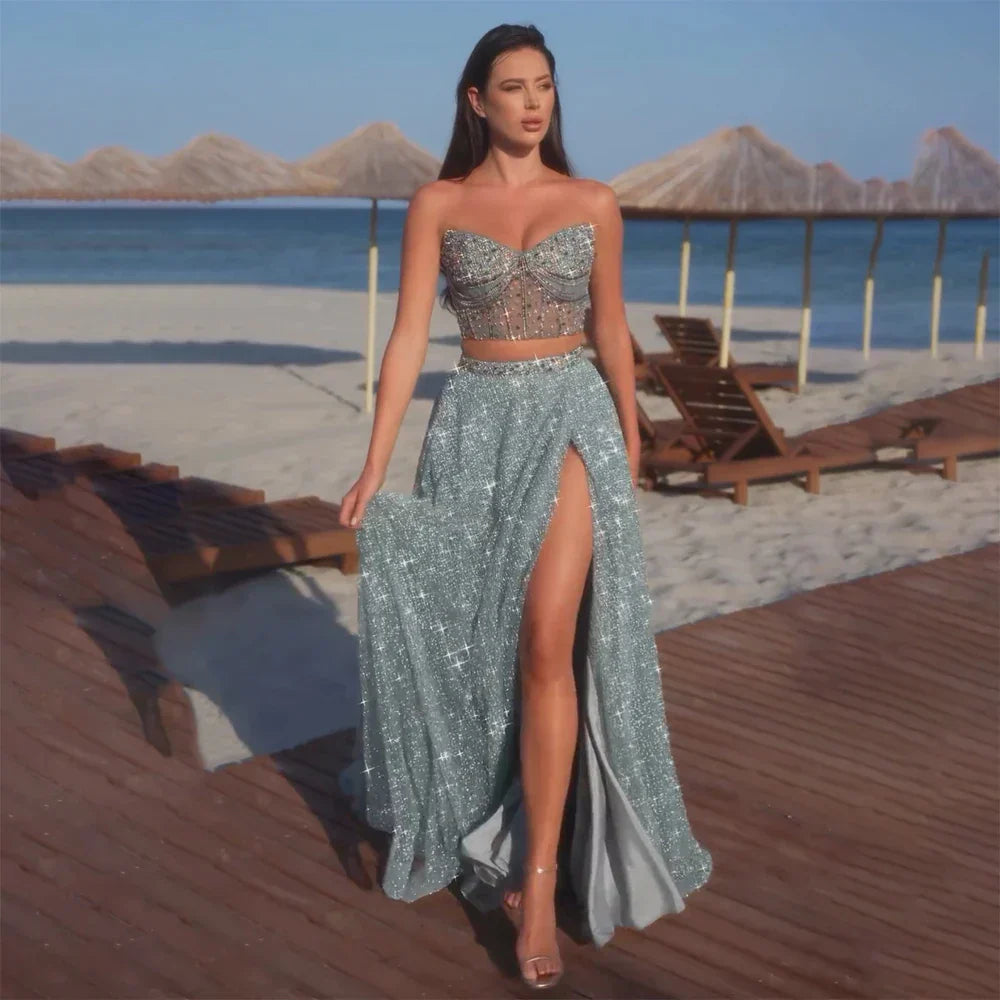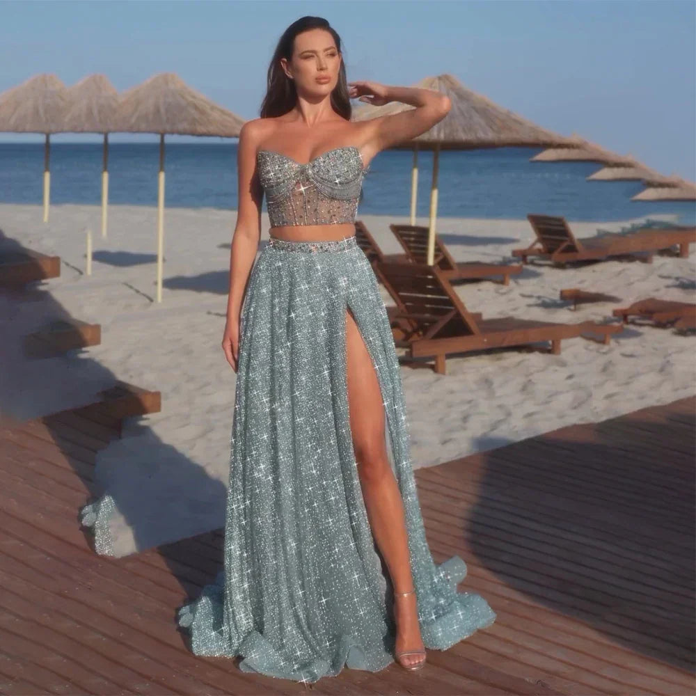 Customize 2025 Saudi Turquoise Strapless Two-Piece Evening Dress with High Split for Formal Occasion LA72786