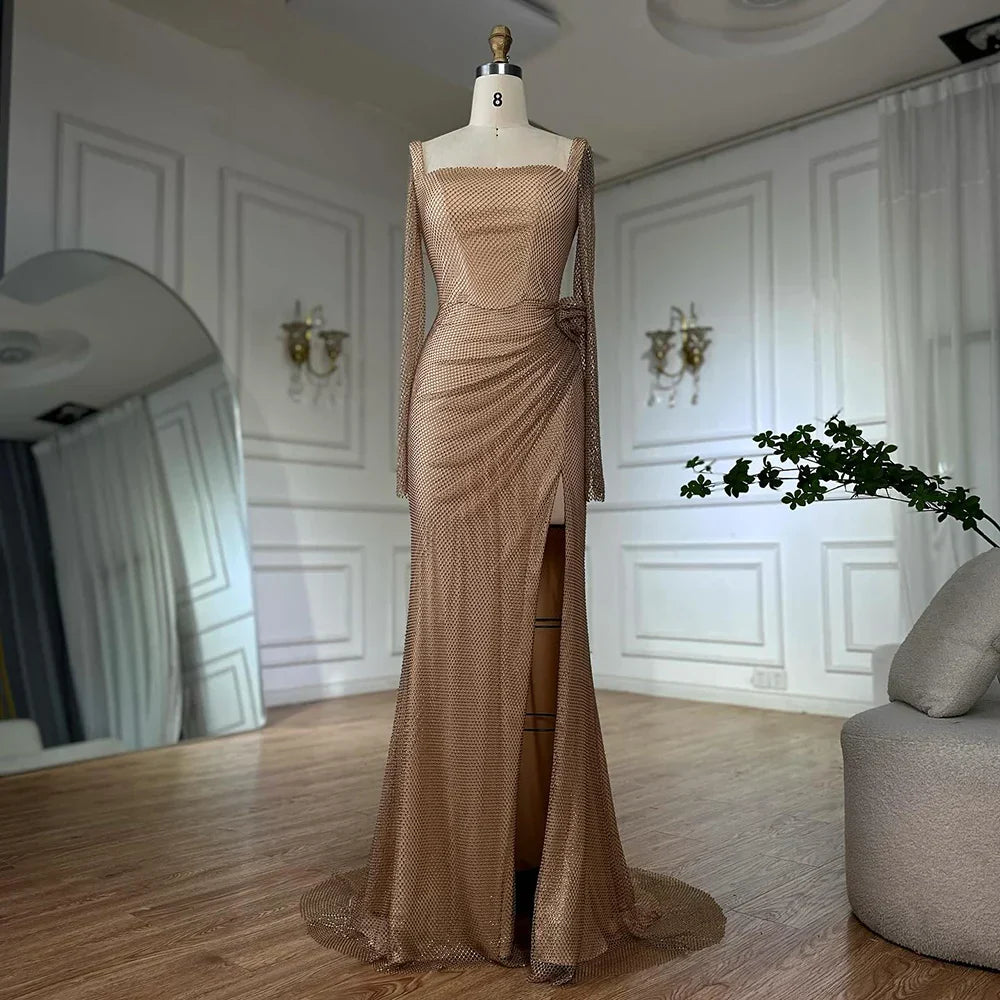 Customize 2025 Nude Elegant High Split Beaded Mermaid Saudi Arabic Evening Dresses Gown For Formal Occasion LA72801A