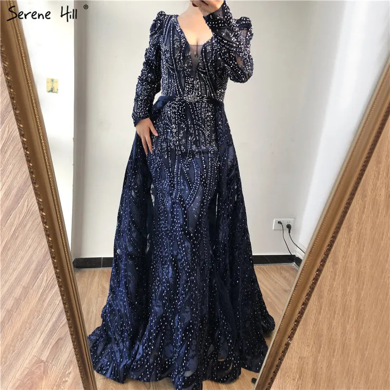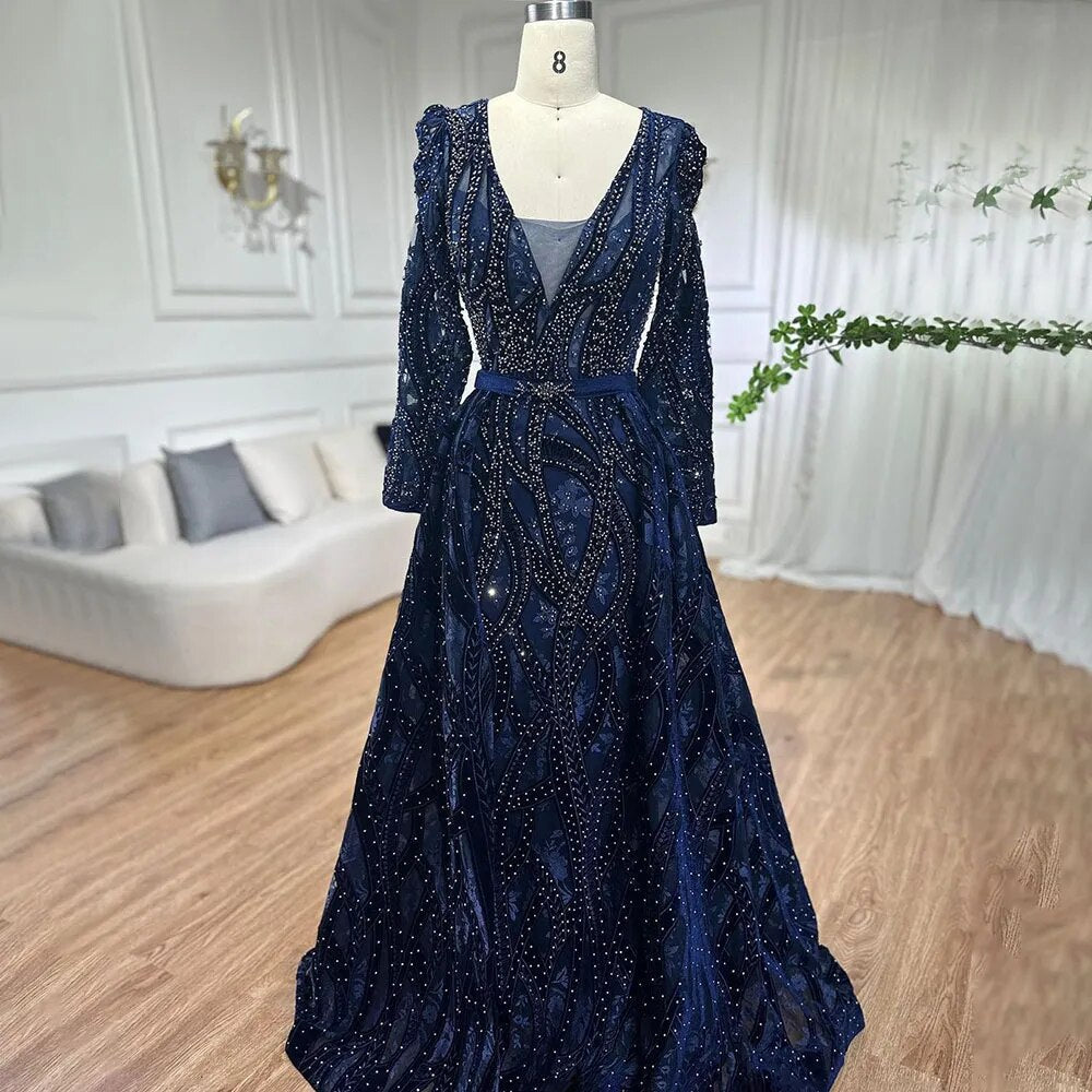 Dubai Blue Mermaid Deep-V Crystal Sexy Long Sleeves Luxury Party Dresses Formal Women Evening 2025 Plus Size LA70223