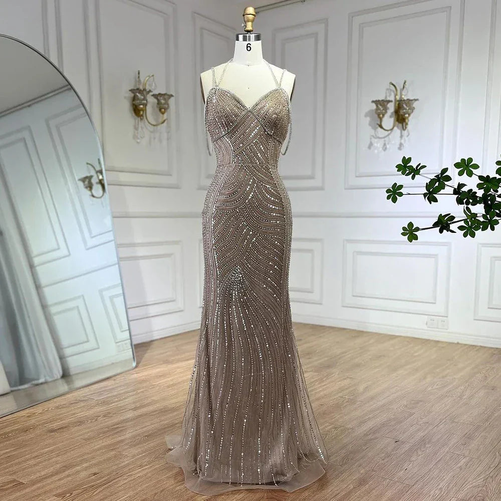 Dubai Caramel Luxury Beaded Spaghetti Strap Mermaid Evening Dresses Gowns for Women Wedding Party 2025 LA72501