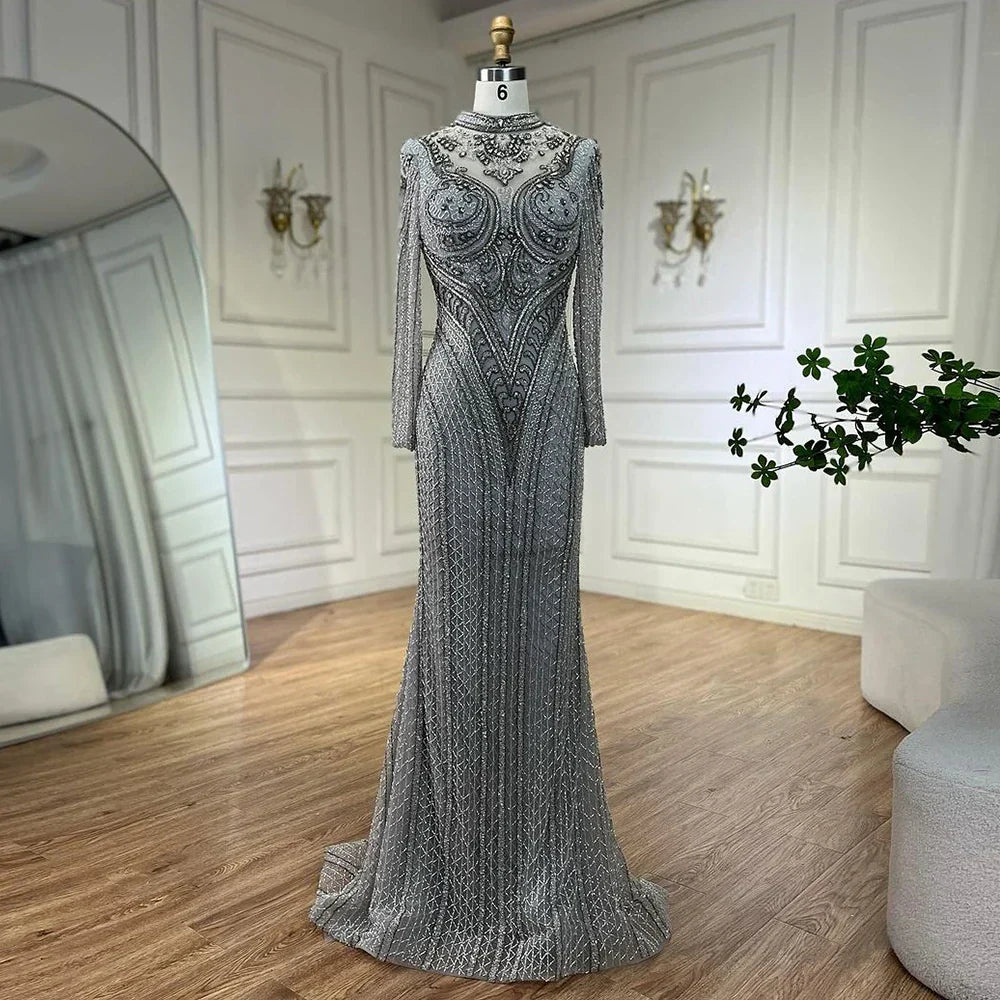 Dubai Gray Mermaid Elegant Lace Crystal Beaded Luxury Evening Dresses Gowns For Women Wedding Party 2025 LA72516