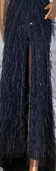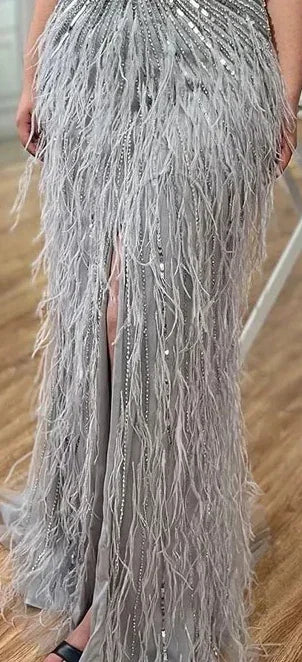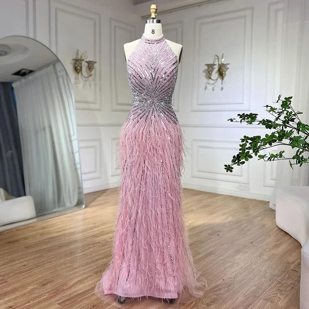 Dubai Halter Beige Feathers Beaded Formal Luxury Mermaid Evening Dresses For Women Wedding Party 2025 LA70623A