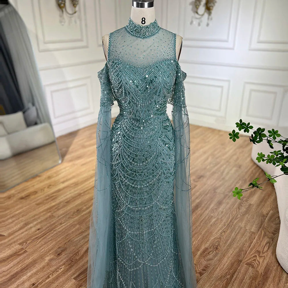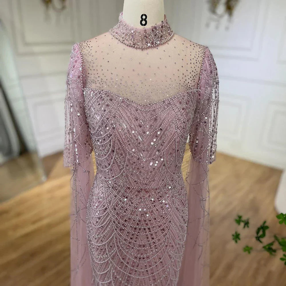 Dubai Pink Cape Sleeves Mermaid Beaded Luxury Long Arabic Evening Dresses Gowns for Woman Wedding Party LA71992A