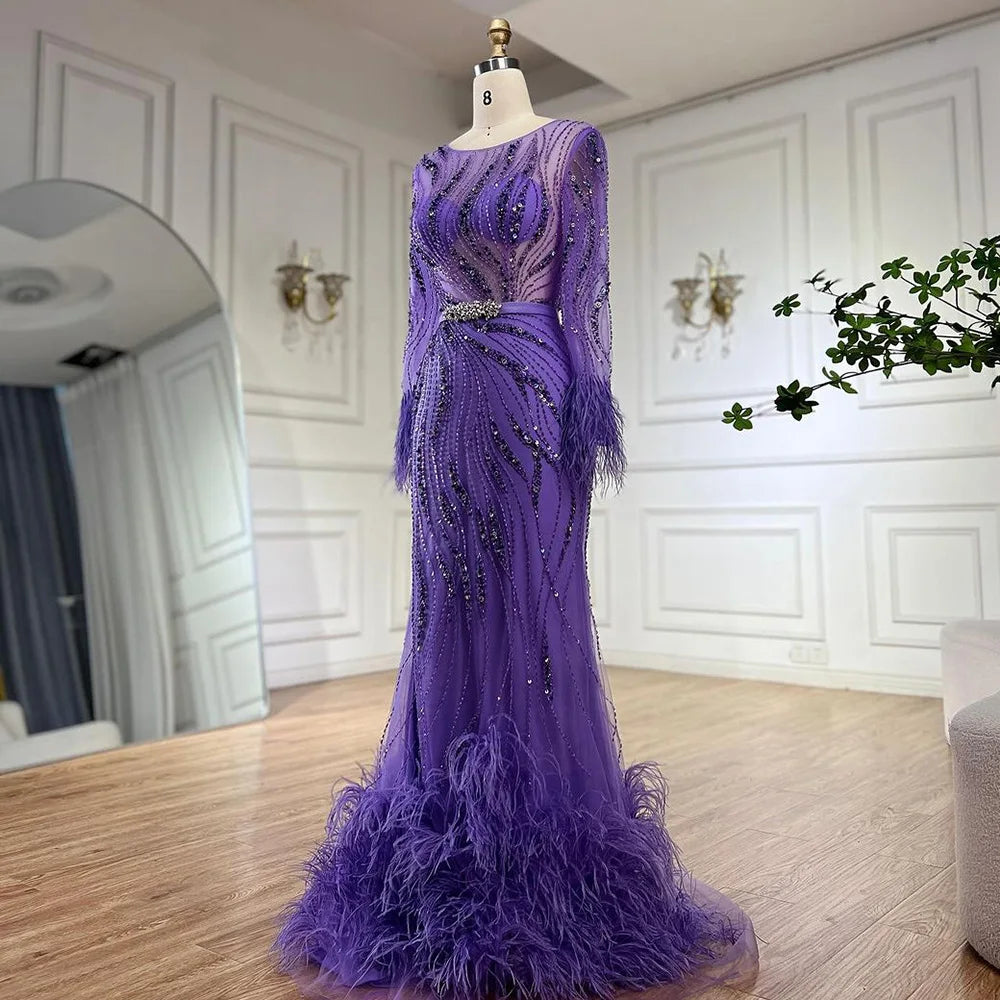 Elegant Mermaid Evening Dress Arabic Purple Beaded Feathers | Luxury Gown for Women's Wedding Party 2025 LA72367