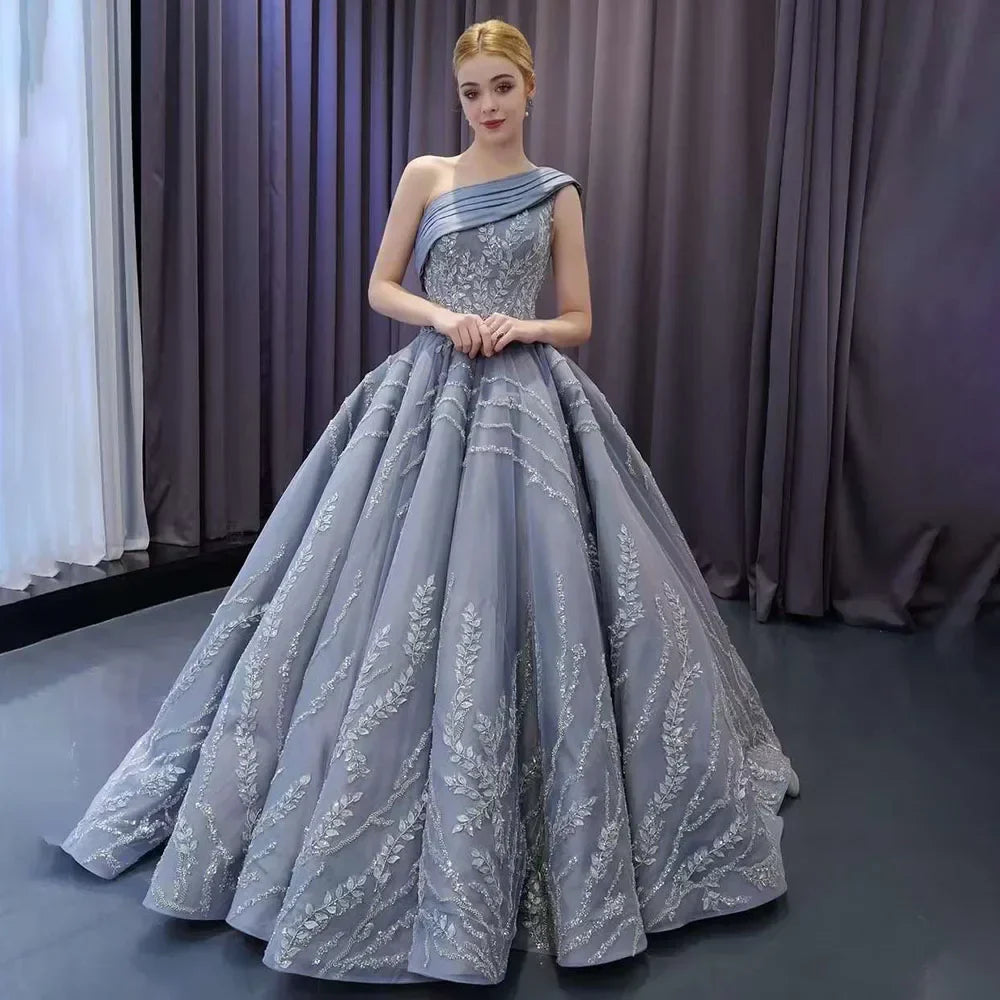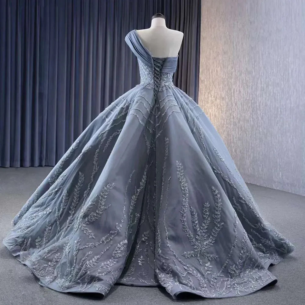 Gray One Shoulder Lace Up Beaded Luxury Ball Gown Bride Gowns Wedding Dress 2025 High End Custom Made HM231074