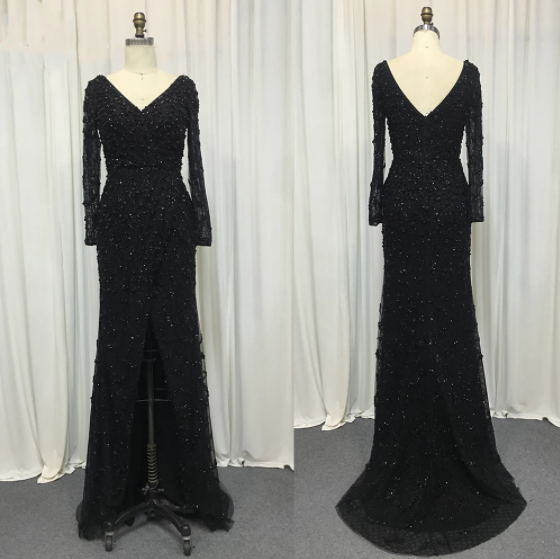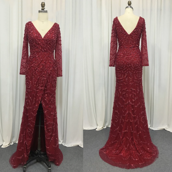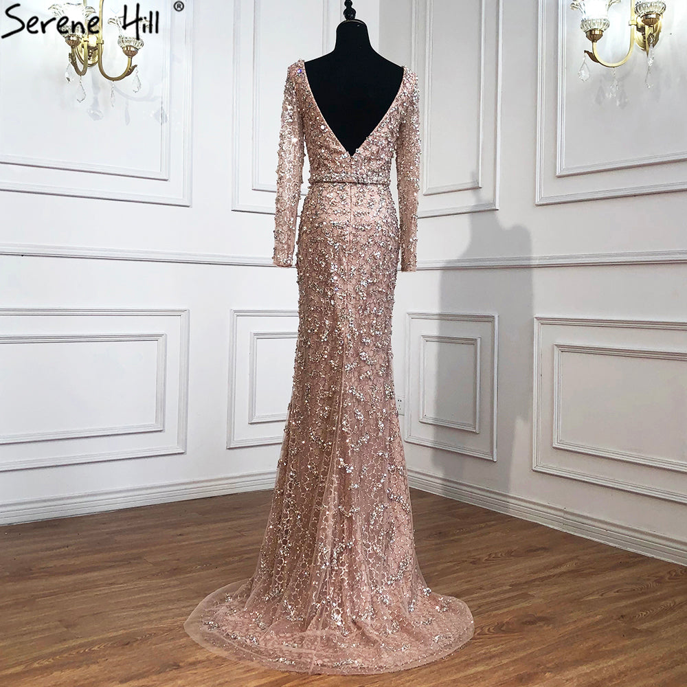 Green Mermaid Elegant V-Neck Pearls Long Sleeves Evening Dresses Luxury Beaded 2025 For Women Wedding Party LA70499