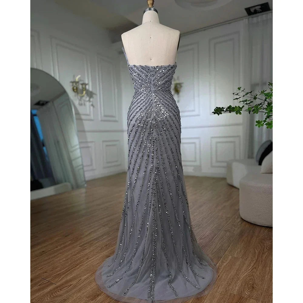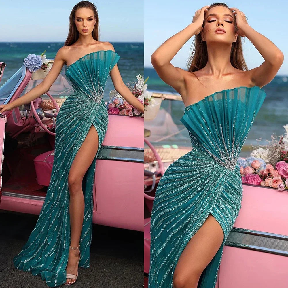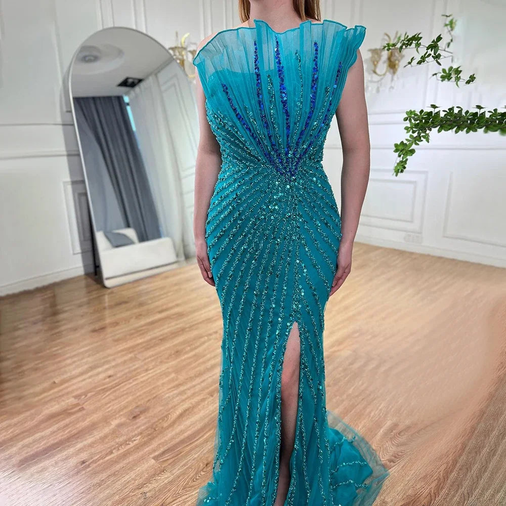 Green Mermaid High Split Off Shoulder Beaded Luxury Dubai Evening Dresses Gowns 2025 For Women Party LA72049