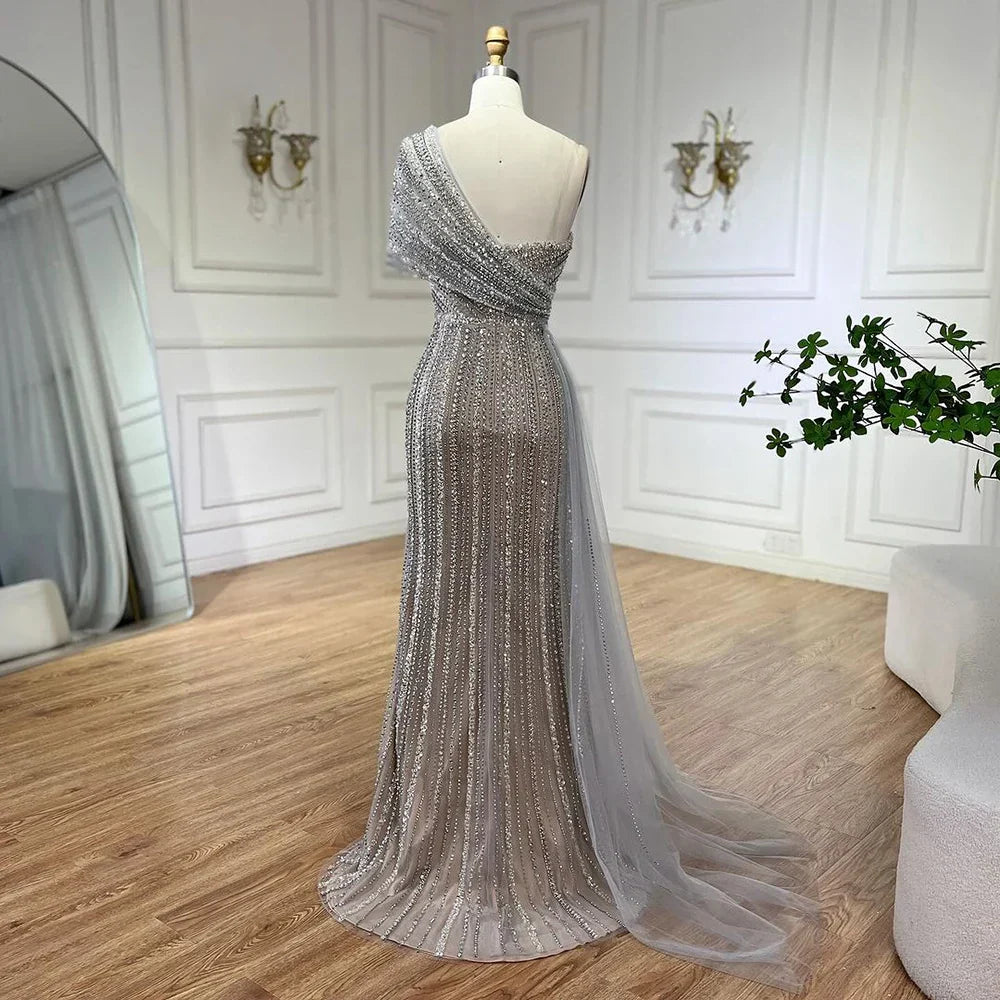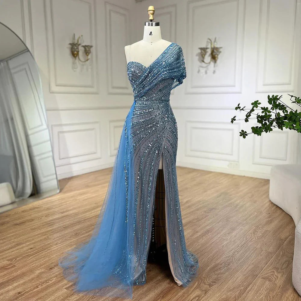 Green Mermaid High Split One Shoulder Beaded Evening Dresses Gowns for Women Wedding Party 2025 LA72364