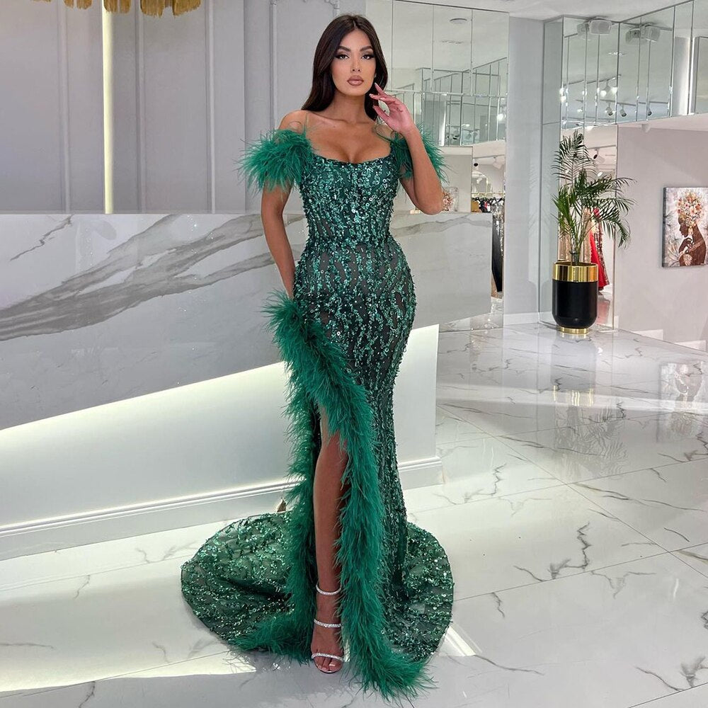 Green Mermaid Sexy High Split Luxury Beaded Feather Evening Dresses Gowns 2025 For Woman Wedding Party LA72043