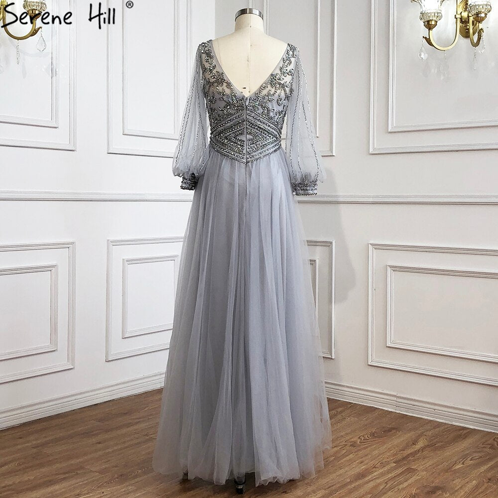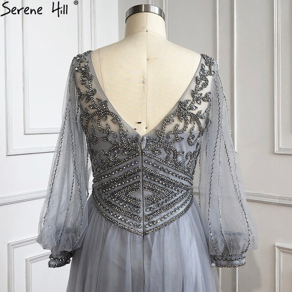 Grey A-Line Beaded Evening Dresses Gowns 2025 Long Lantern Sleeves Luxury For Women Party LA70964