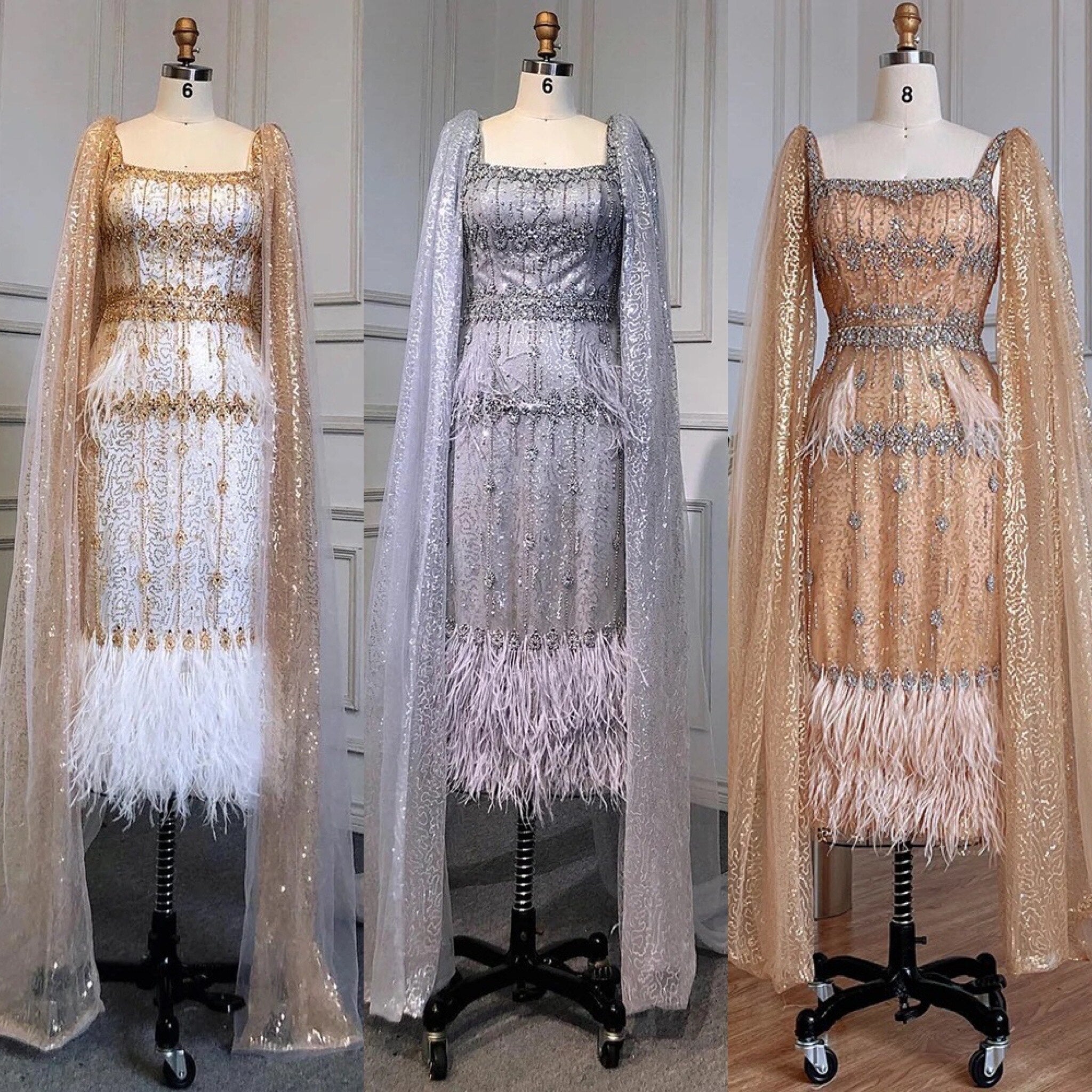 Grey Mermaid Midi Length Evening Dresses Gowns Beaded Sexy Feather Rear Leg Split 2025 For Women Party LA71669