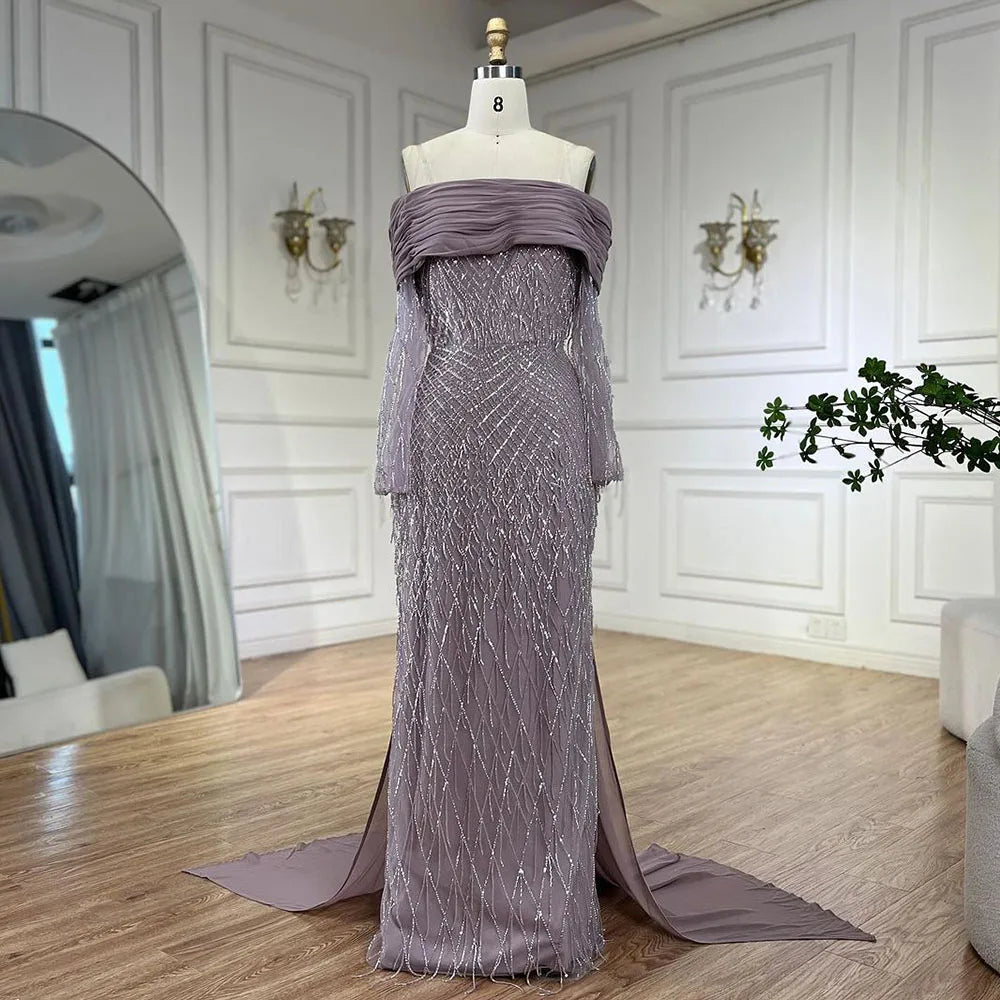 This luxurious evening dress in lilac features an off-shoulder design and a stunning tassel detail. Made with high-quality materials. it's sure to turn heads at any event. The matching cape adds sophistication and versatility. Perfect for formal occasions. weddings. and more.